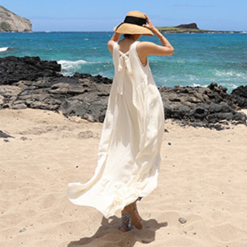 ワンピース リネン コットン ロングワンピ リボン Aライン Vネック リゾート フェミニン カワイイ カジュアル ゆるカワ マキシ丈 旅行 大人 カジュアル シンプル 無地 春 夏 大きいサイズ