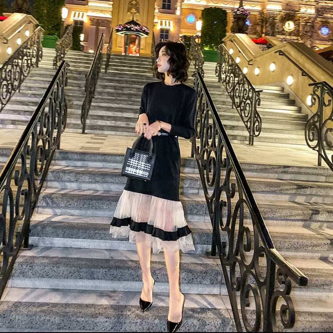 長袖 ニット ワンピース レース シック 大人 ベルト 上品 エレガント キレイめ お出かけ お買い物 デート 女子会 春 秋 通学 学生 通勤 韓国ファッション