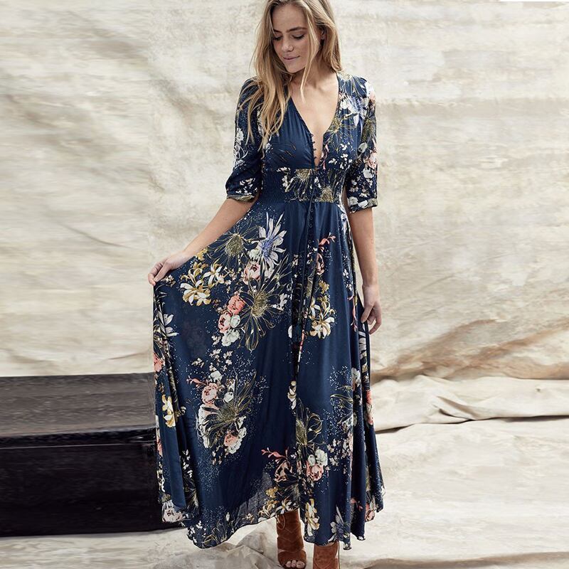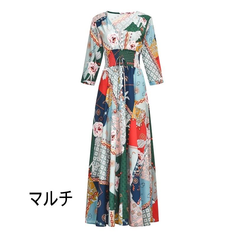 全5種 マキシ丈ワンピース ロングワンピース 花柄 エンパイア ワンピ フレア 七分袖 ボタン Aライン ヨーロピアン 総柄 ボタニカル リゾート ドレス 旅行 エレガント クラシカル