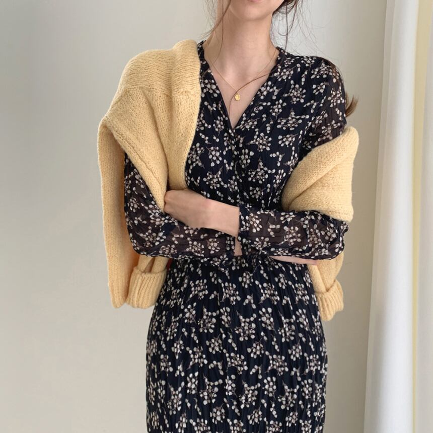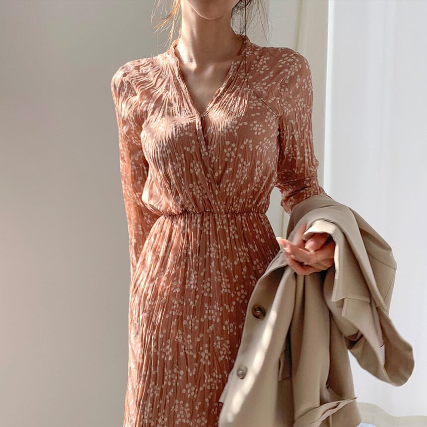 全2色 花柄 シフォン カシュクール ワンピース クリンクルプリーツ Vネック 長袖 ハイウエスト マキシ丈 ロング丈 可愛い レディース 大人可愛い フェミニン ガーリー レトロ お出かけ 通勤 買い物 デート 女子会 春 秋