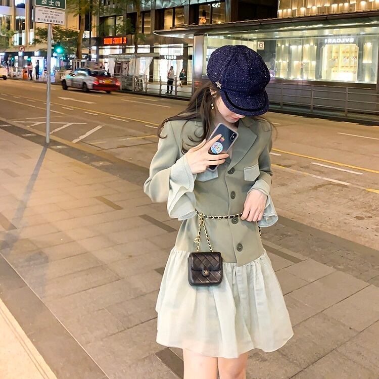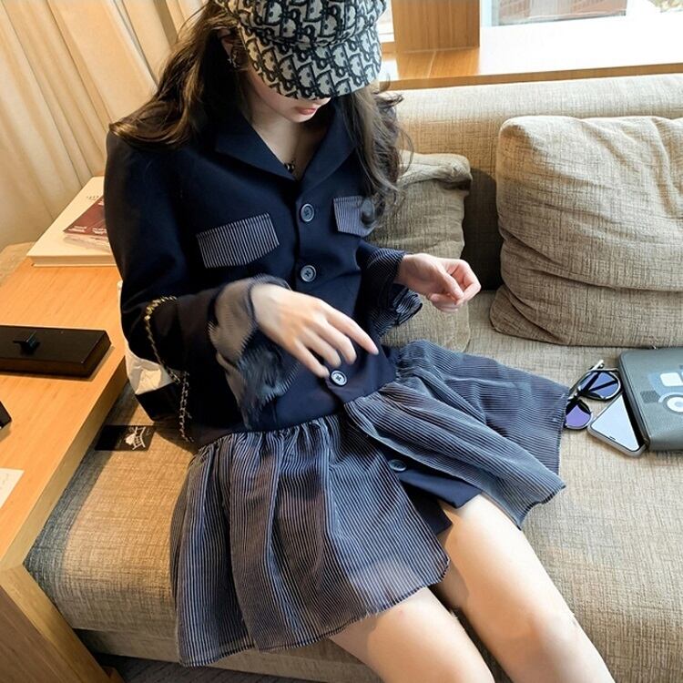 テーラードジャケットとレーススカートがドッキングしたワンピース。