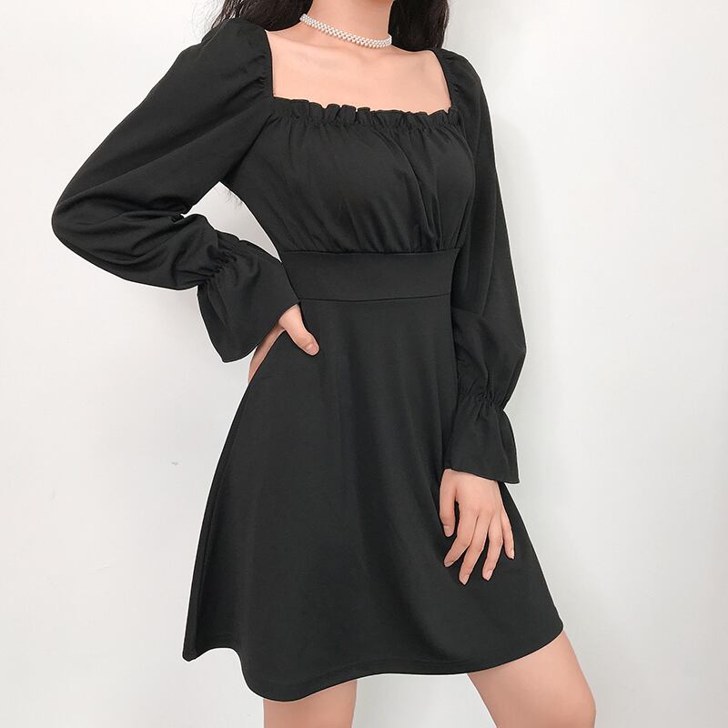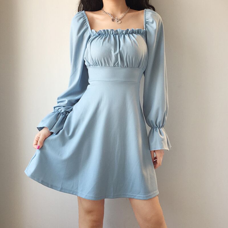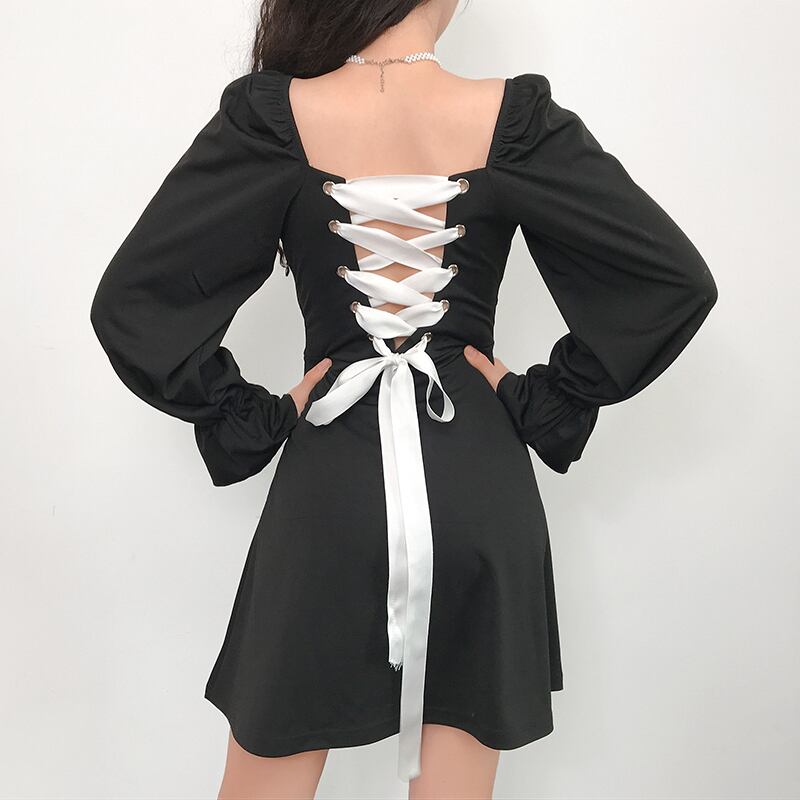 全4色 ミニワンピース ミニドレス バックコンシャス レースアップ スクエアネック 無地 長袖 ハイウエスト きれいめ パーティ デート ホワイト ブルー ブラック ピンク