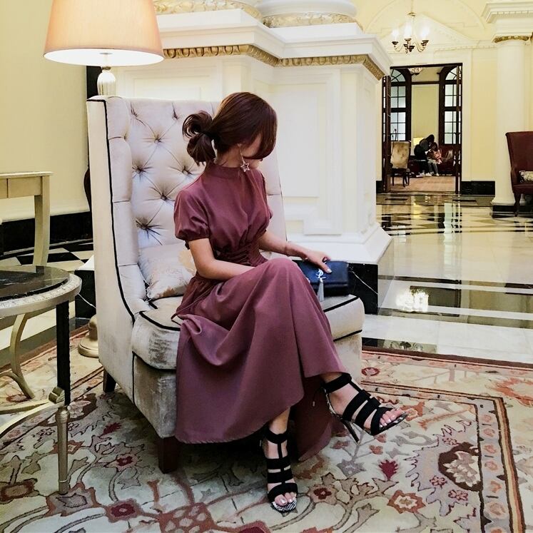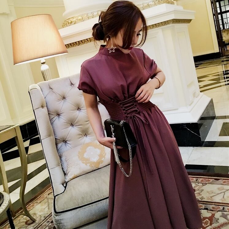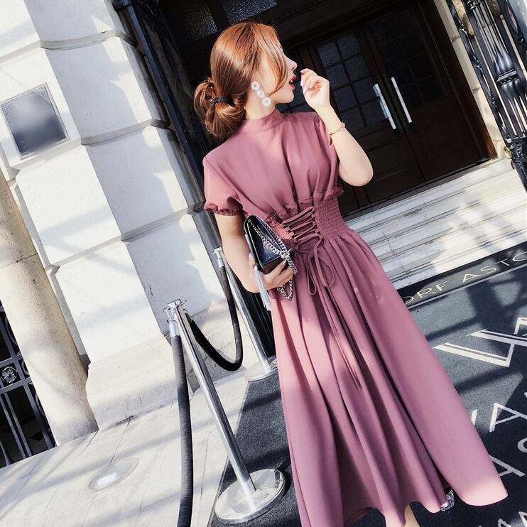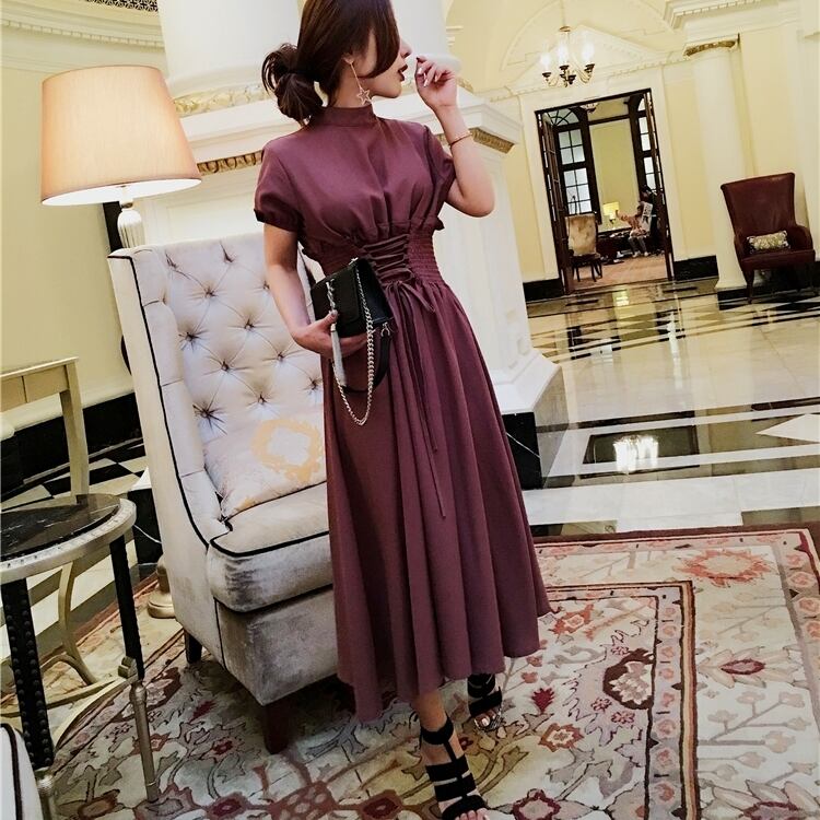 レースアップ ワンピース フレア Aライン ボトルネック 半袖 ミモレ丈 エレガント 大人 レディース ガーリー レトロ フェミニン シック ブラウン お呼ばれ ドレス フォーマル ウエストゴム 春 夏 秋