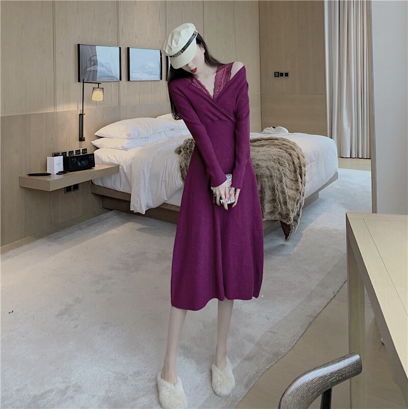 全3色 レース ニット ワンピース Aライン フレア ニット リブニット Vネック カシュクール タイト 長袖 ロングスリーブ 無地 シンプル 大人 ミモレ丈 ワンピ エレガント セクシー ガーリー 春 秋