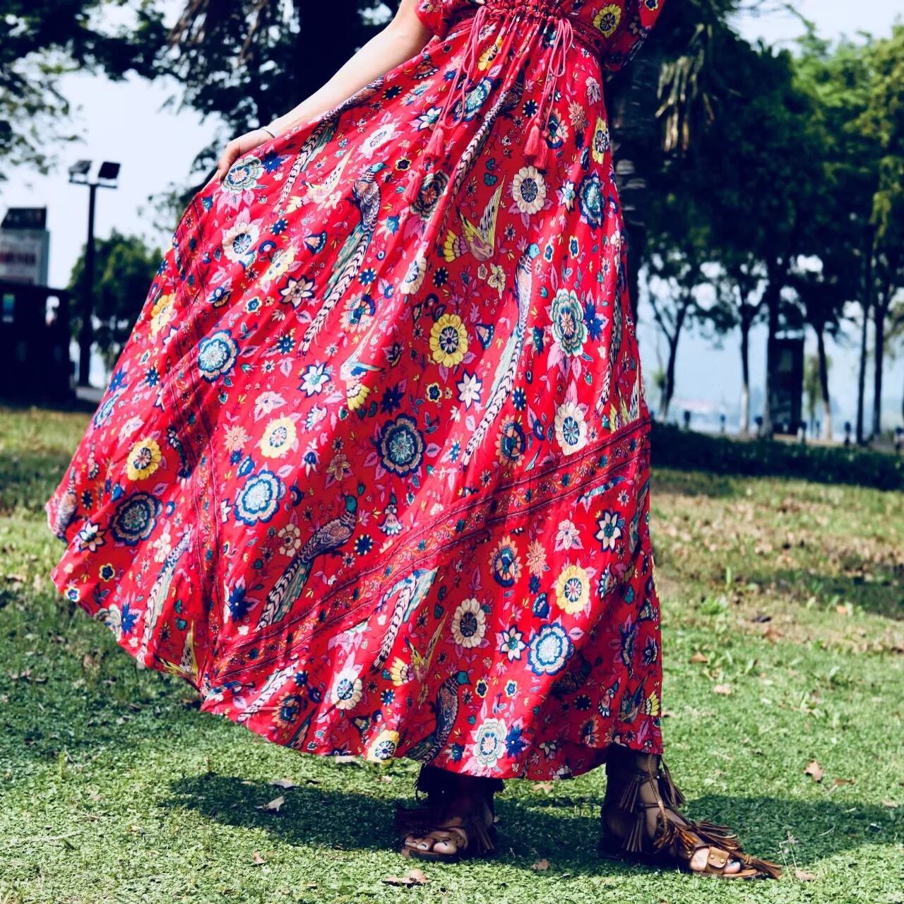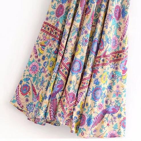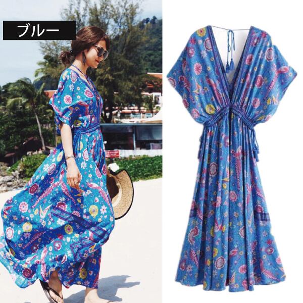 全3色 花柄 フラワー ボタニカル柄 ワンピース バックコンシャス タッセル ロング丈 マキシ丈 Aライン 半袖 ゆったり Vネック ワンピ 大人可愛い トレンド きれいめ エキゾチック フェミニン ナチュラル デート リゾート 旅行 春 夏