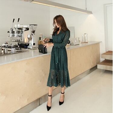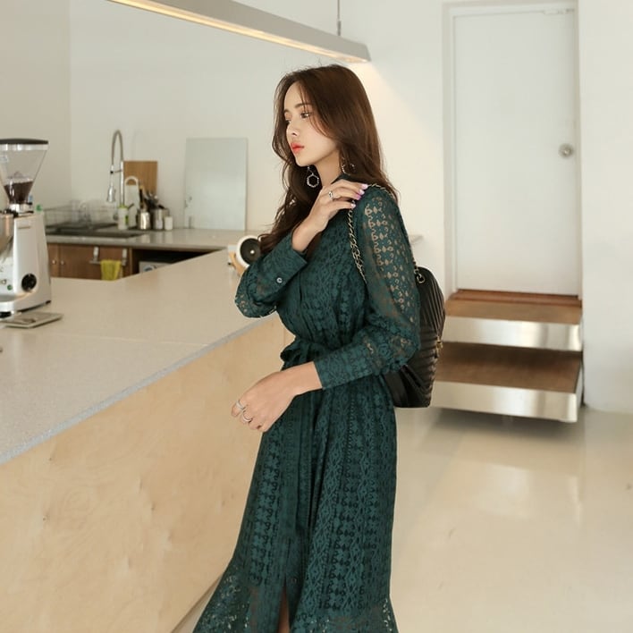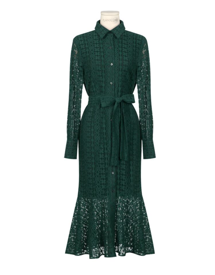 全2色 メッシュ レース ミモレ丈 ワンピース フレア Aライン レトロ ウエストリボン 襟 長袖 シャツ風 ボタン レディース ロングスリーブ 大人 女子 お出かけ お呼ばれ オフィス 春 夏 秋
