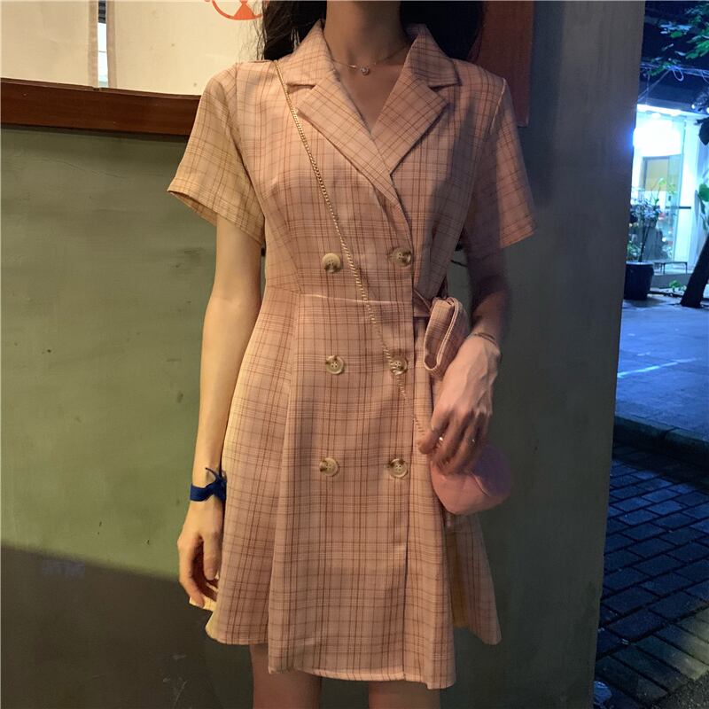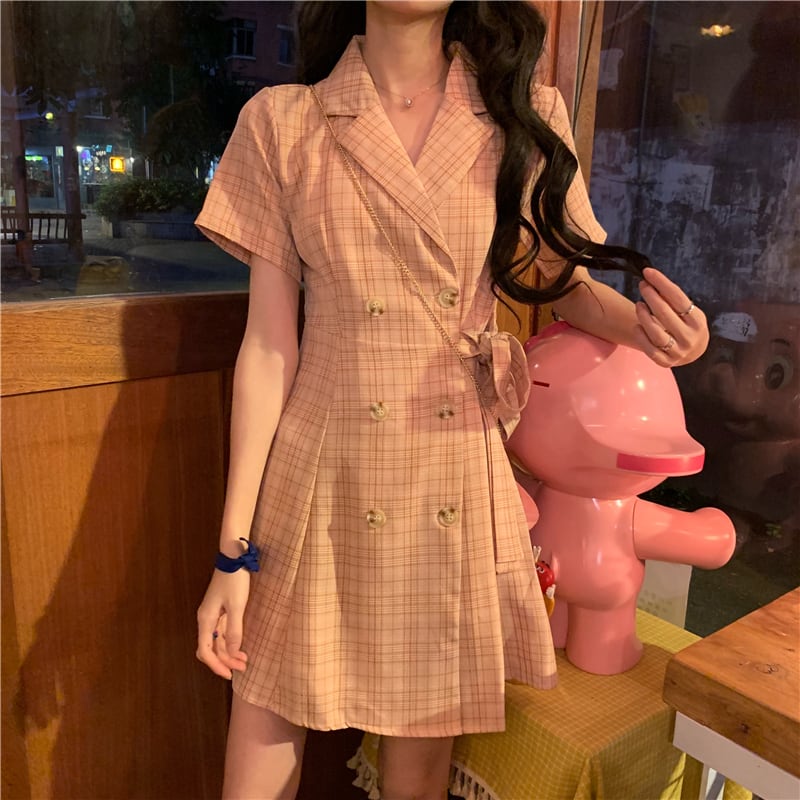 チェック ワンピース ミニワンピ トレンチ風 ボタン リボンベルト 半袖 レトロ ガーリー カワイイ オシャレ クラシック ピンク 春 夏 Aライン 襟 Vネック