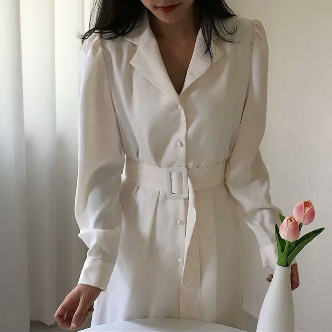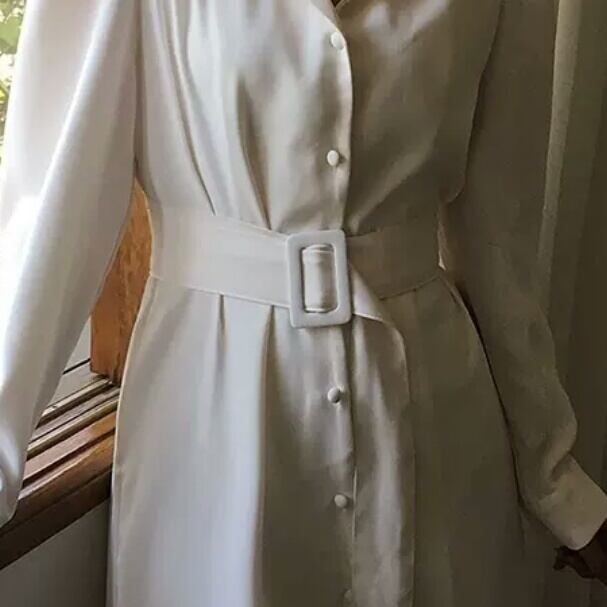 襟つき ロング丈 フィッシュテール ワンピース ベルト 大人 無地 シンプル 上品 キレイめ 可愛い シック お出かけ お買い物 デート 女子会 春 秋 通学 学生 通勤 韓国ファッション
