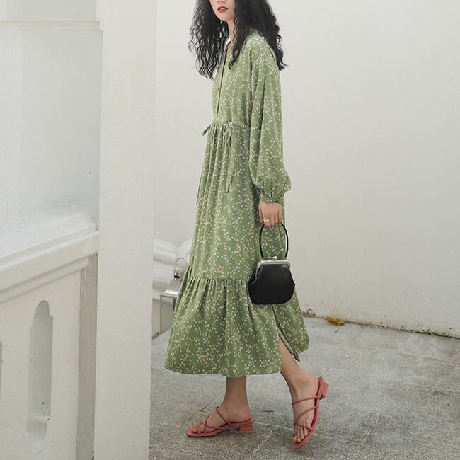 全2色 フラワー 小花柄 ワンピース ティアード フロントボタン フレア ハイウエスト ウエストリボン Vネック 長袖 ワンピ ロング丈 マキシ丈 可愛い 大人可愛い レディース ガーリー レトロ 清楚 上品 お出かけ 通勤 買い物 デート 女子会 春 夏