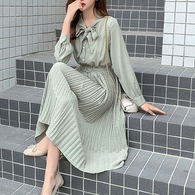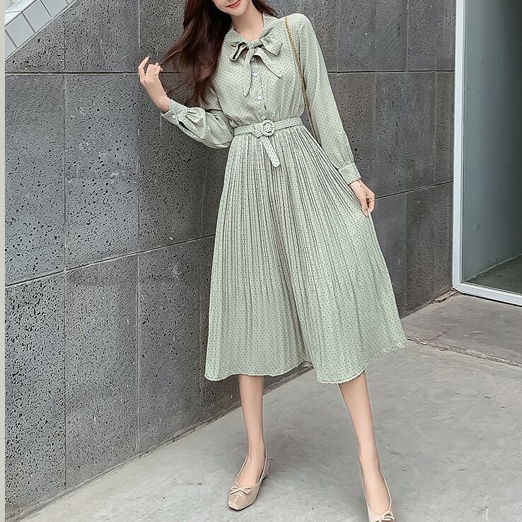 全3色 ドット 水玉 ワンピース プリーツ ボウタイ フレア ラウンドネック ベルト付き ハイウエスト Aライン 長袖 ワンピ ひざ丈 ミモレ丈 可愛い 大人可愛い カジュアル レディース ガーリー レトロ 清楚 上品 お出かけ 通勤 買い物 デート 女子会 大きいサイズ 春