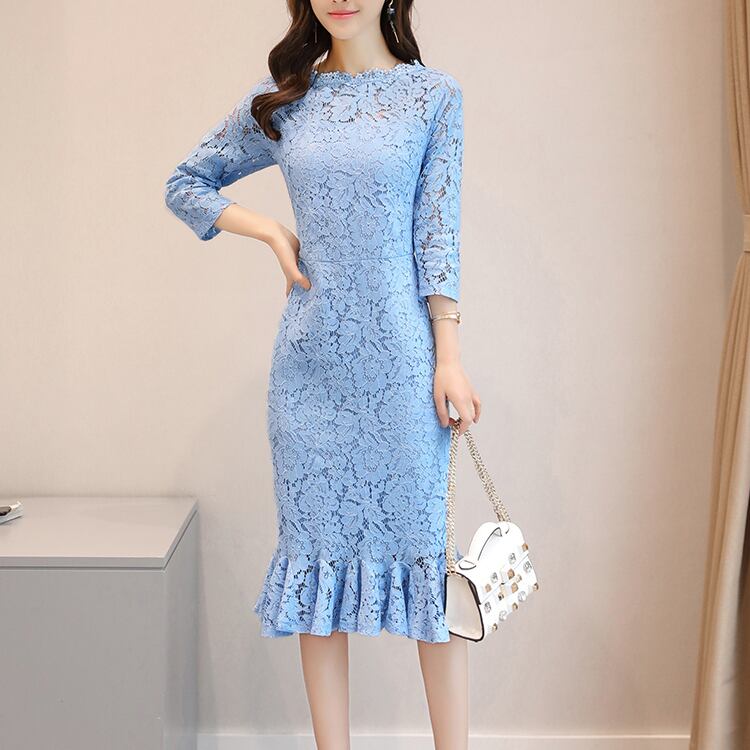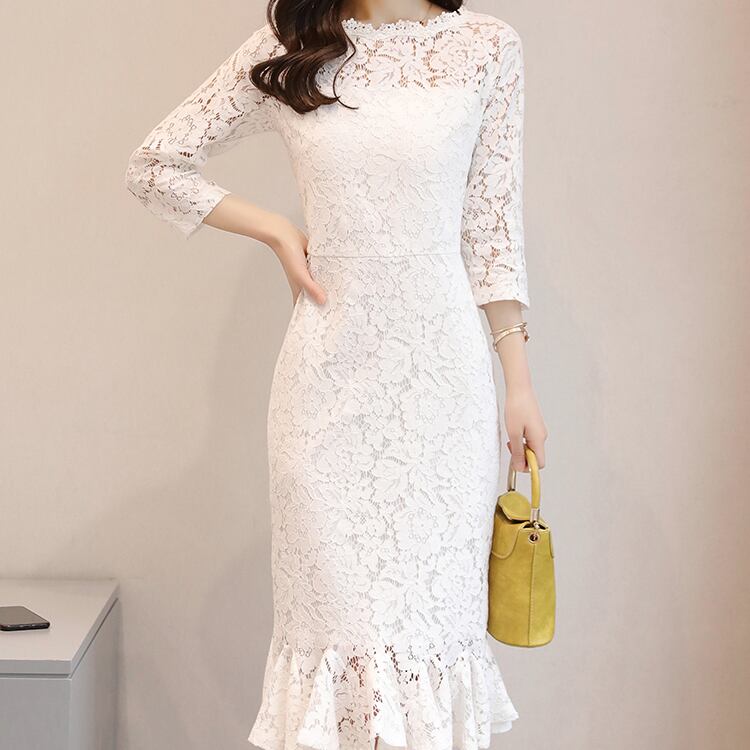 全3色 花柄 レース ワンピース ボディコンシャス タイト ひざ丈 ミモレ丈 総レース 透け感 ハイウエスト マーメイド ラウンドネック ワンピ 大人可愛い きれいめ フェミニン セクシー パーティー デート 女子会 大きいサイズ 春 秋