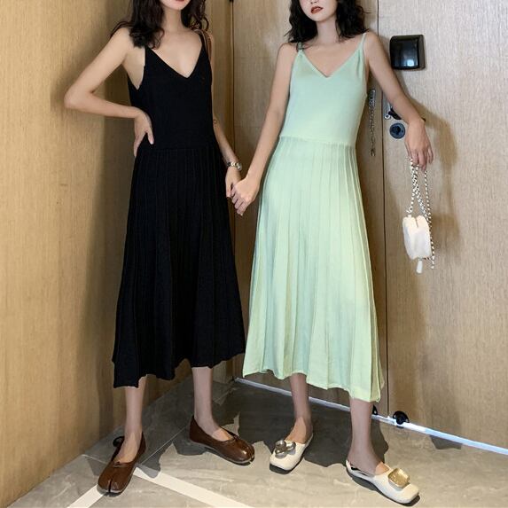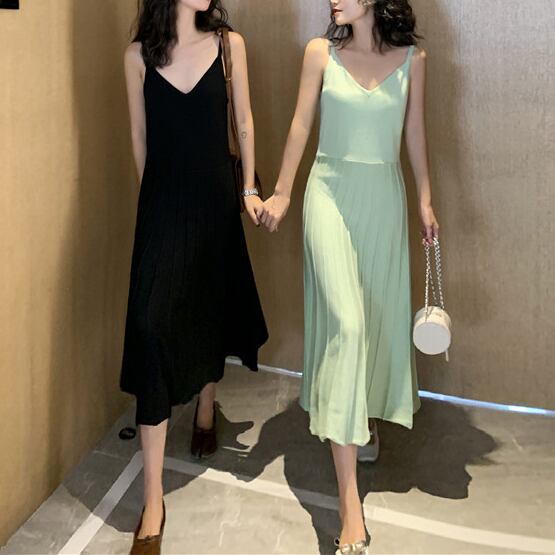 全3色 プリーツ ニット ワンピース ひざ丈 ミモレ丈 ハイウエスト ノースリーブ Vネック キャミワンピ ワンピ 大人可愛い トレンド きれいめ フェミニン カジュアル ガーリー セクシー デート 女子会 大きいサイズ 春 夏