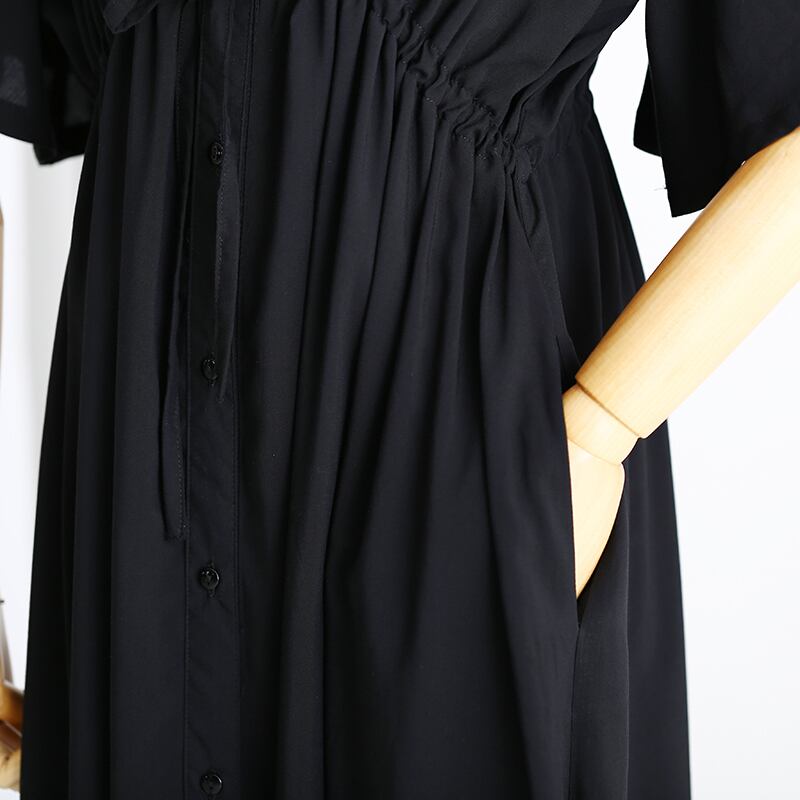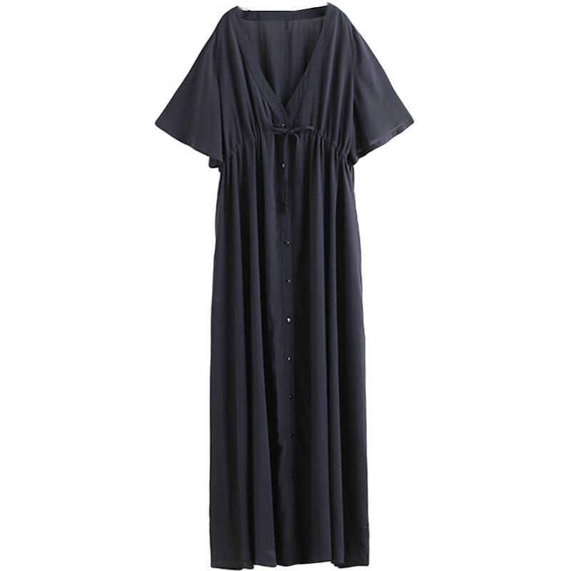 ロングワンピース Vネック エンパイア 半袖 ウエストゴム マキシ丈 ワンピ 無地 ブラック 黒 ゆったり マタニティー マタママ プラスサイズ 春 夏 秋