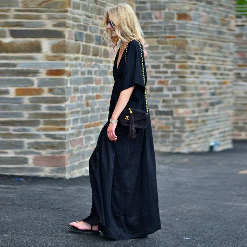 VネックのAラインシルエットワンピースはマキシ丈で、エンパイア風のワンピースです。