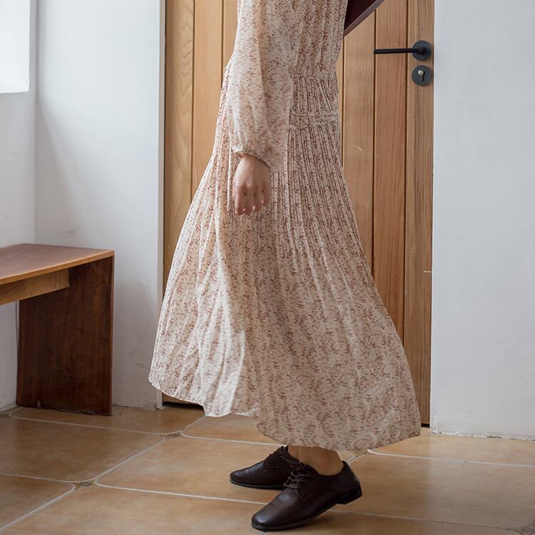 小花柄 フラワー キーネック ワンピース プリーツ ランタンスリーブ フレア Vネック ハイウエスト Aライン 長袖 ワンピ ロング丈 マキシ丈 可愛い 大人可愛い カジュアル レディース フェミニン ガーリー レトロ 清楚 上品 お出かけ 通勤 買い物 デート 女子会 春