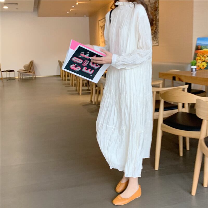 全2色 しわ加工 ワンピース プリーツ ティアード ゆったり ハイネック フリルネック 長袖 ハイウエスト Aライン ワンピ ミモレ丈 ひざ丈 可愛い 大人可愛い きれいめ 可愛い カジュアル レディース ガーリー ナチュラル レトロ フェミニン お出かけ 通勤 買い物 デート 女子会 春