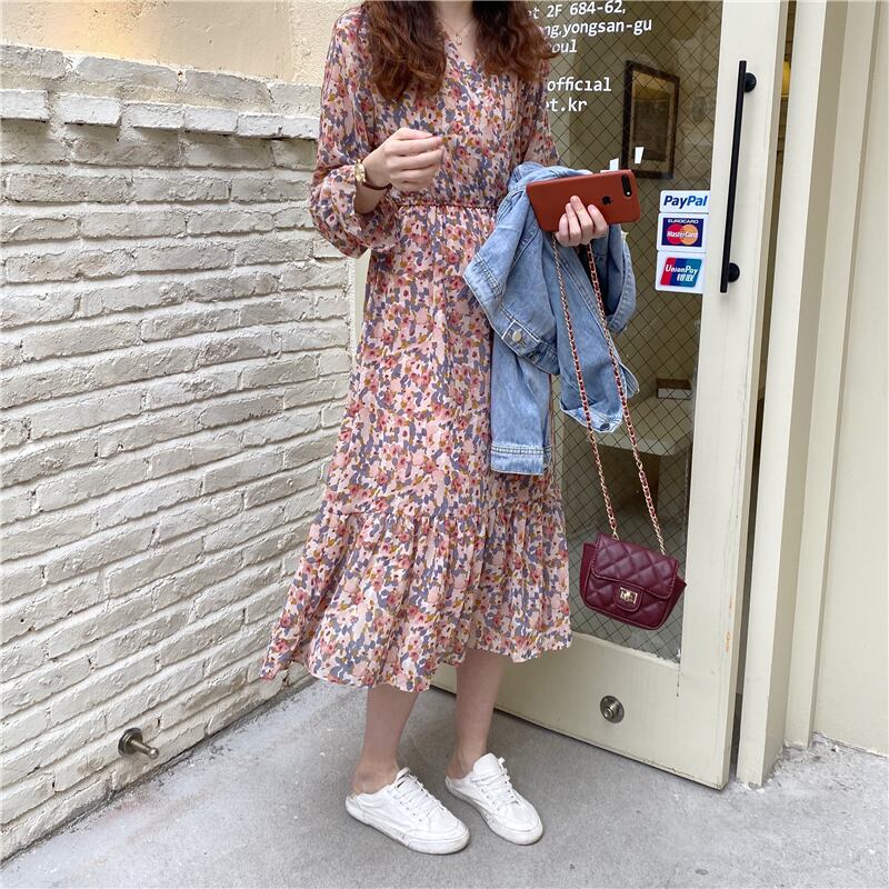 花柄 フラワー カシュクールワンピース ティアード シフォン フレア ハイウエスト Vネック キャンディスリーブ 長袖 ワンピ ひざ丈 ミモレ丈 可愛い カジュアル 大人可愛い レディース ガーリー 清楚 上品 お出かけ 通勤 買い物 デート 女子会 春
