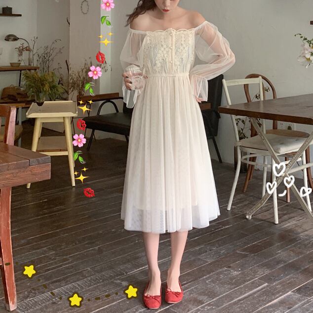 2way ワンピース 花柄レース 花柄 刺繍 シースルー スクエアネック フレア ハイウエスト ランタンスリーブ Aライン 長袖 ワンピ ひざ丈 ミモレ丈 可愛い 大人可愛い レディース ガーリー レトロ フェミニン 清楚 上品 お出かけ 通勤 買い物 デート 女子会 春 夏