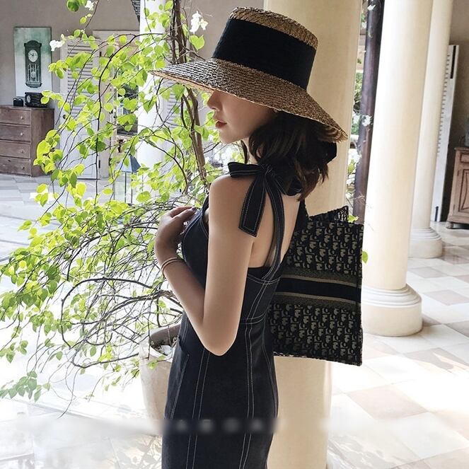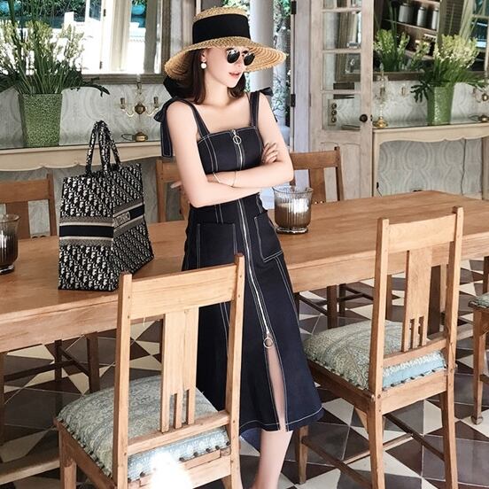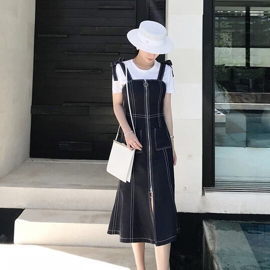 デニム ワンピース ステッチ フレア ジップ 肩紐 ミモレ丈 レトロ カワイイ 大人 シンプル 上品 ジャンパースカート クラシック エレガント カジュアル 春 夏 秋