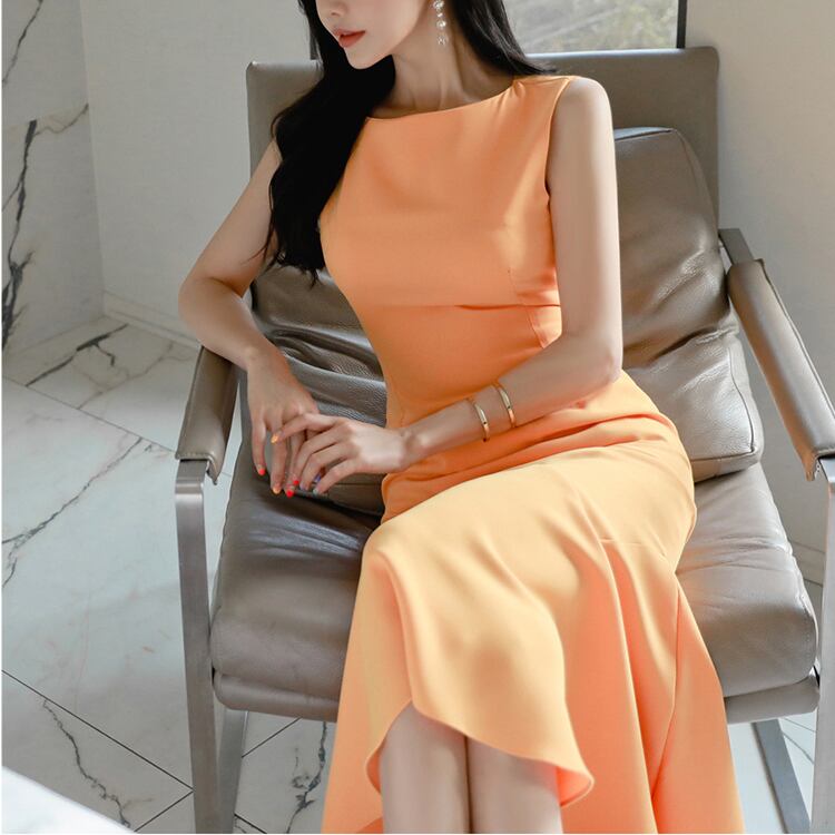 オレンジカラーで華やかさがアップするワンピースです。