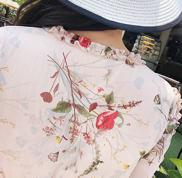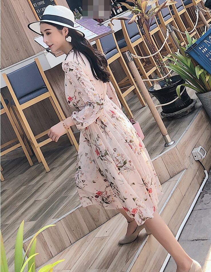 ワンピース 花柄 フレア フリル 長袖 ひざ丈 ウエストリボン ハイウエスト Vネック 可愛い ガーリー 韓国ファッション 上品 カジュアル きれいめ リゾート デート 女子会 春 夏
