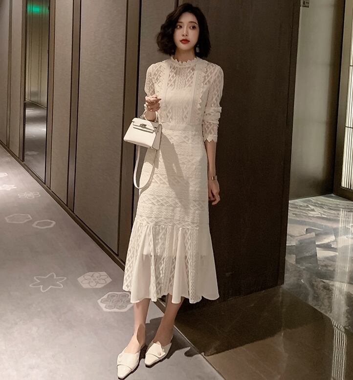 ドレス ワンピース マーメイド フリル タイト スリム レース シースルー 長袖 ハイネック 上品 シック エレガント 大人 きれいめ お呼ばれ パーティー ディナー 春 夏