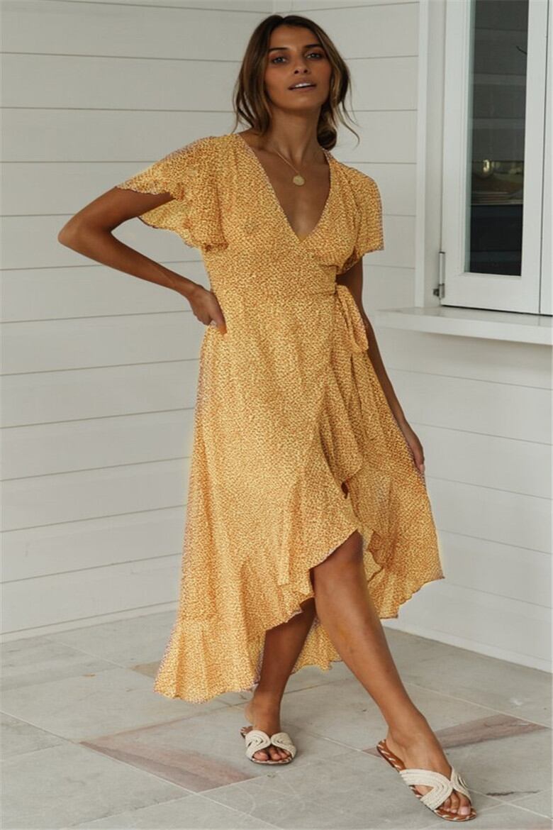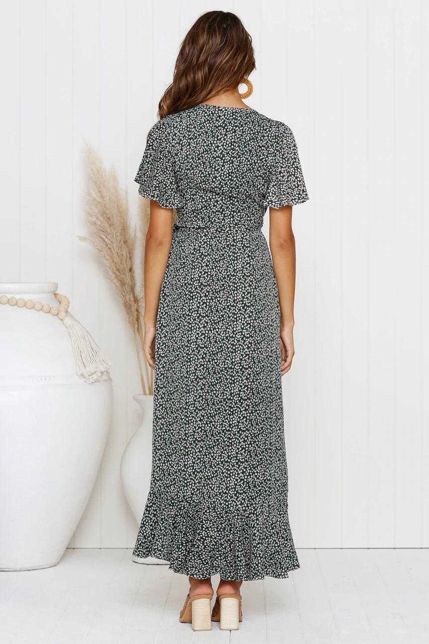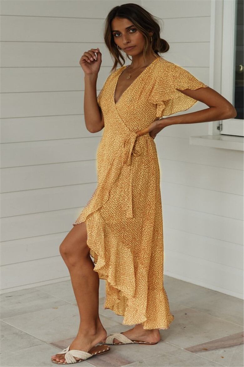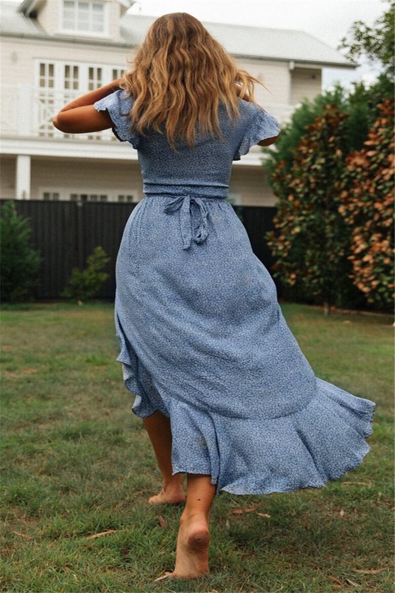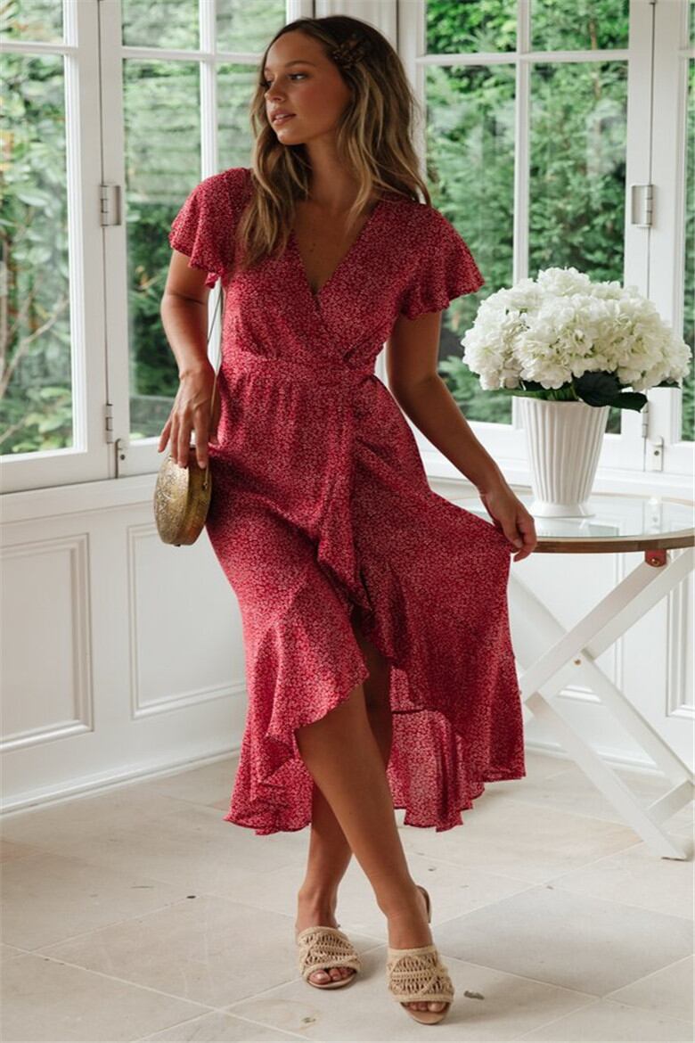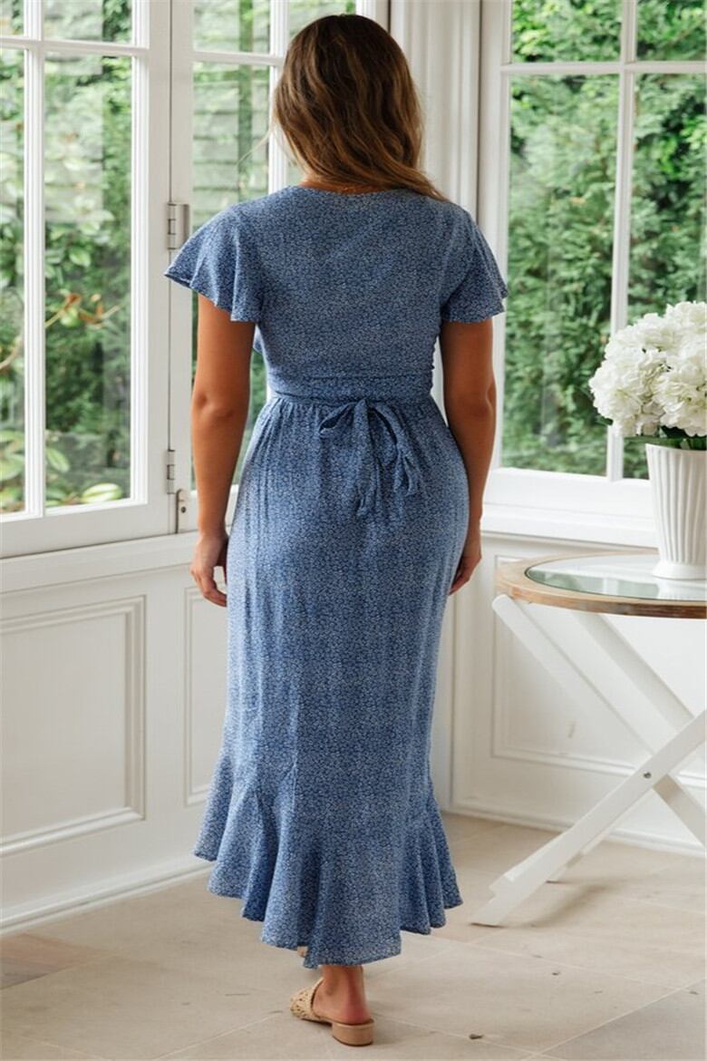 全4色 フィッシュテール ワンピース 花柄 ミモレ丈 フリル Vネック フレア 半袖 サマードレス お呼ばれ リゾート パーティー カシュクール リボン 春 夏 秋