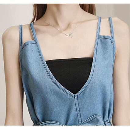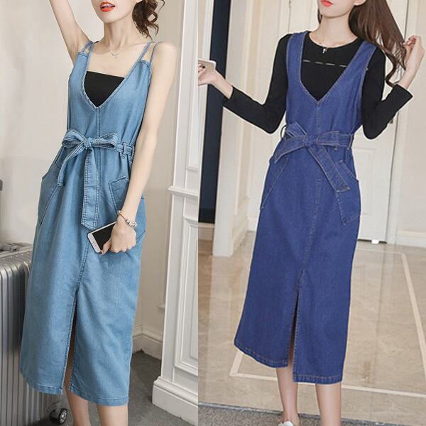 全2種 デニム ワンピース フロントスリット タイト ひざ丈 ミモレ丈 ウエストリボン ハイウエスト ノースリーブ Vネック ワンピ 大人可愛い フェミニン カジュアル ガーリー デート 女子会 春 夏