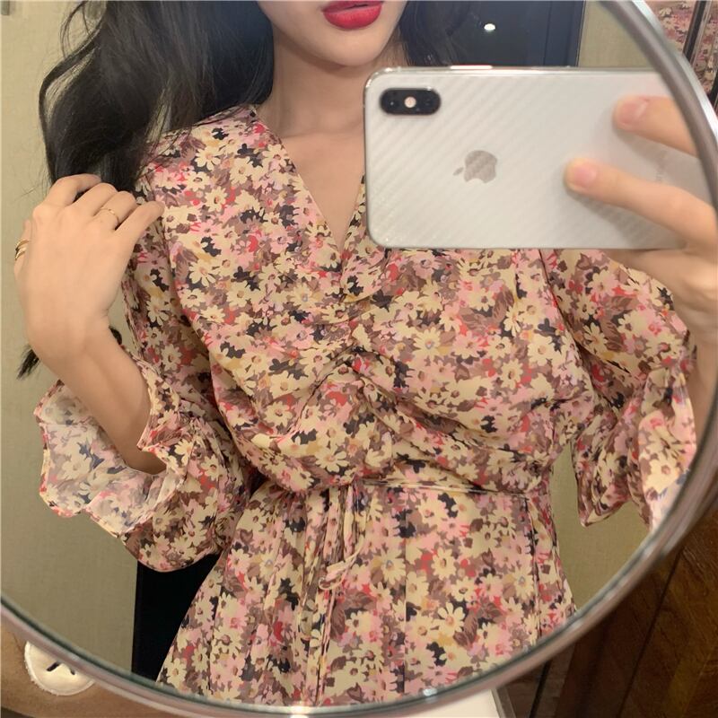 花柄 フラワー ワンピース シャーリング Vネック フレア シフォン ハイウエスト ウエストリボン キャンディスリーブ 長袖 ワンピ ミニ丈 ショート丈 可愛い 大人可愛い レディース ガーリー レトロ 清楚 上品 お出かけ 買い物 デート 女子会 春 夏