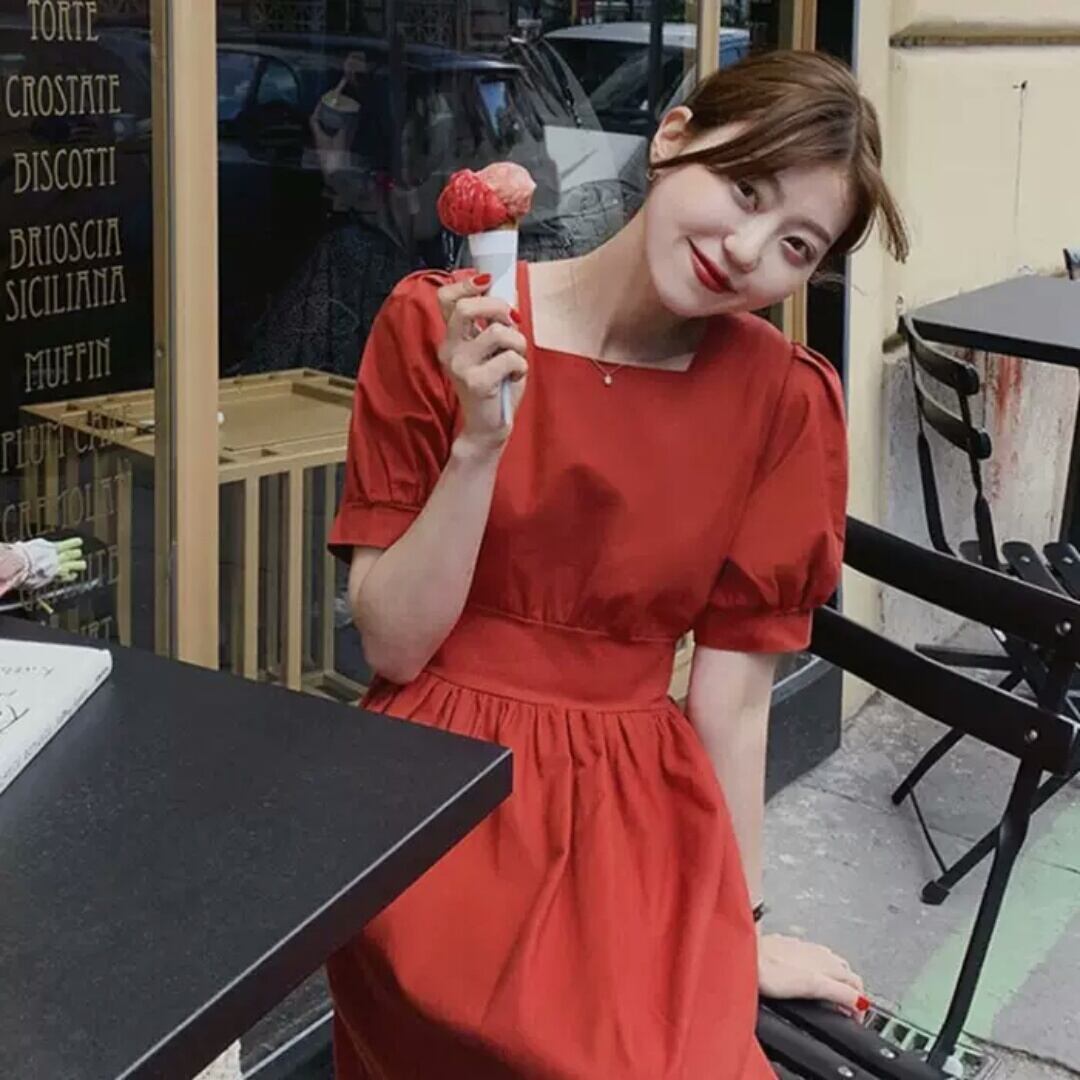 全3色 スクエアカラー 半袖 コットン リネン ワンピース ミモレ丈 ドレス 大人 可愛い キレイめ カジュアル シンプル 無地 お出かけ お買い物 デート 女子会 春 夏 秋 通学 学生 通勤 韓国ファッション