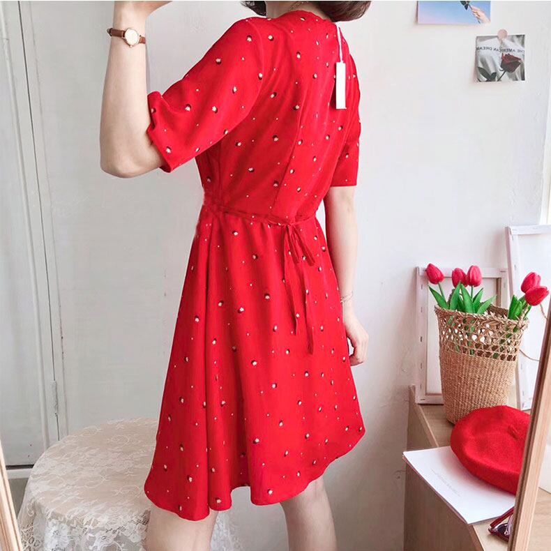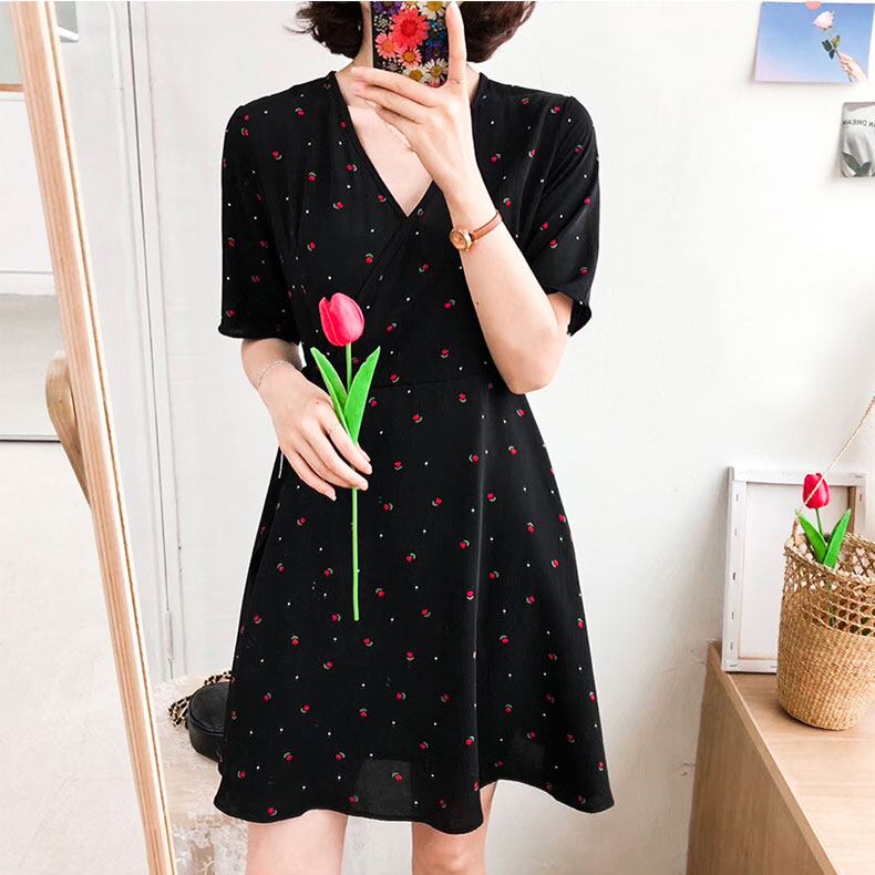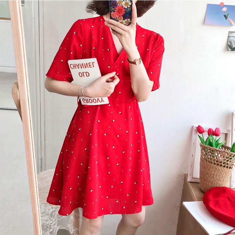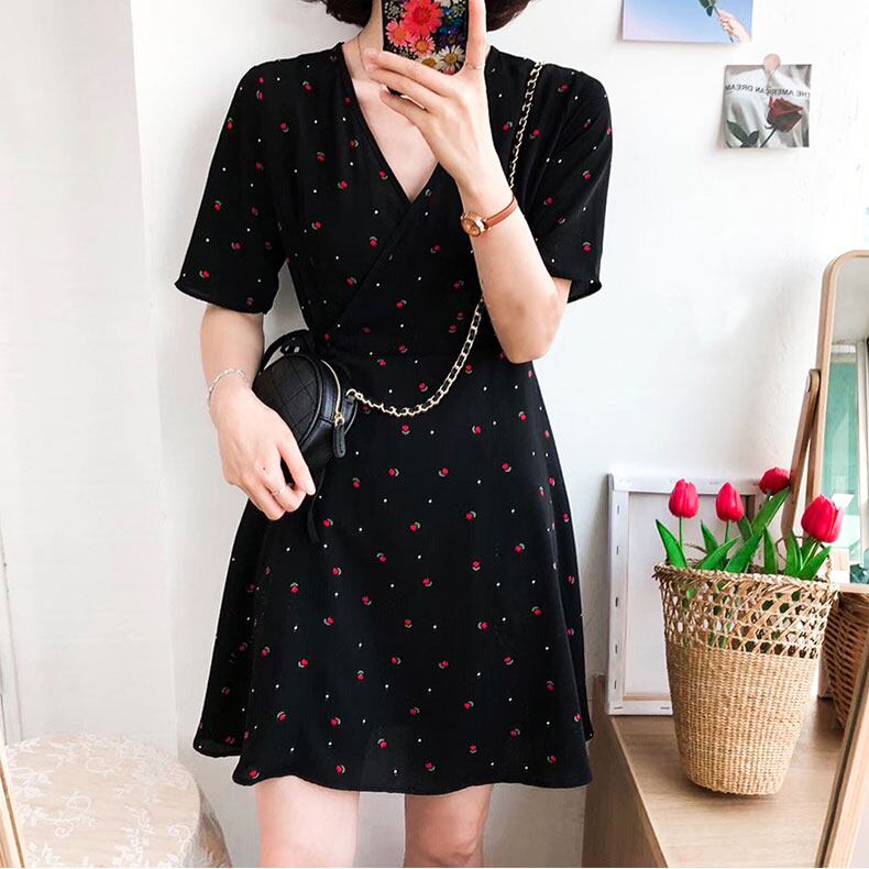 全3色 花柄 ドット 水玉 カシュクールワンピース ラップワンピース Vネック フレア シフォン ハイウエスト ウエストリボン 半袖 ワンピ ミニ丈 ショート丈 可愛い 大人可愛い レディース ガーリー レトロ 清楚 上品 お出かけ 通勤 買い物 デート 女子会 夏