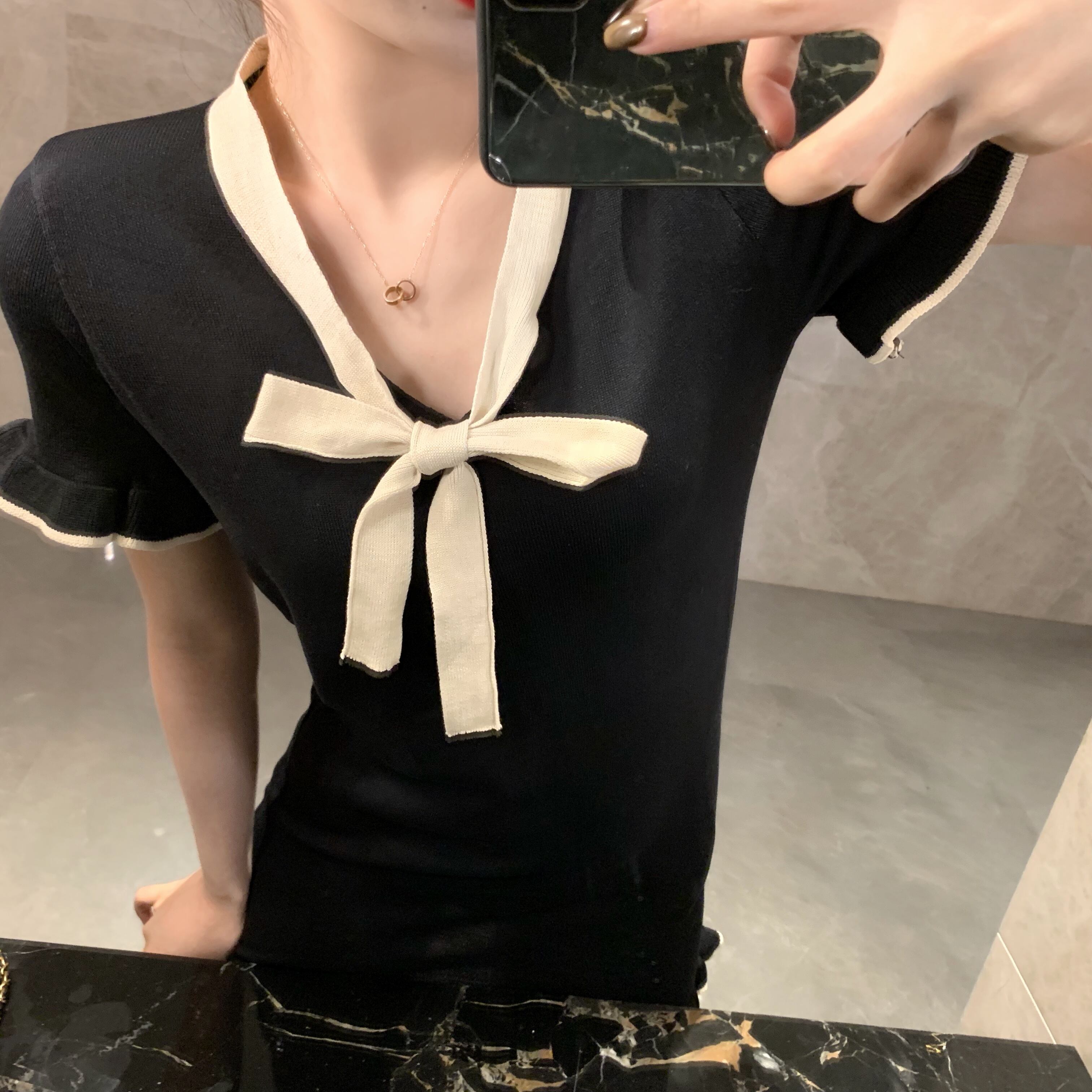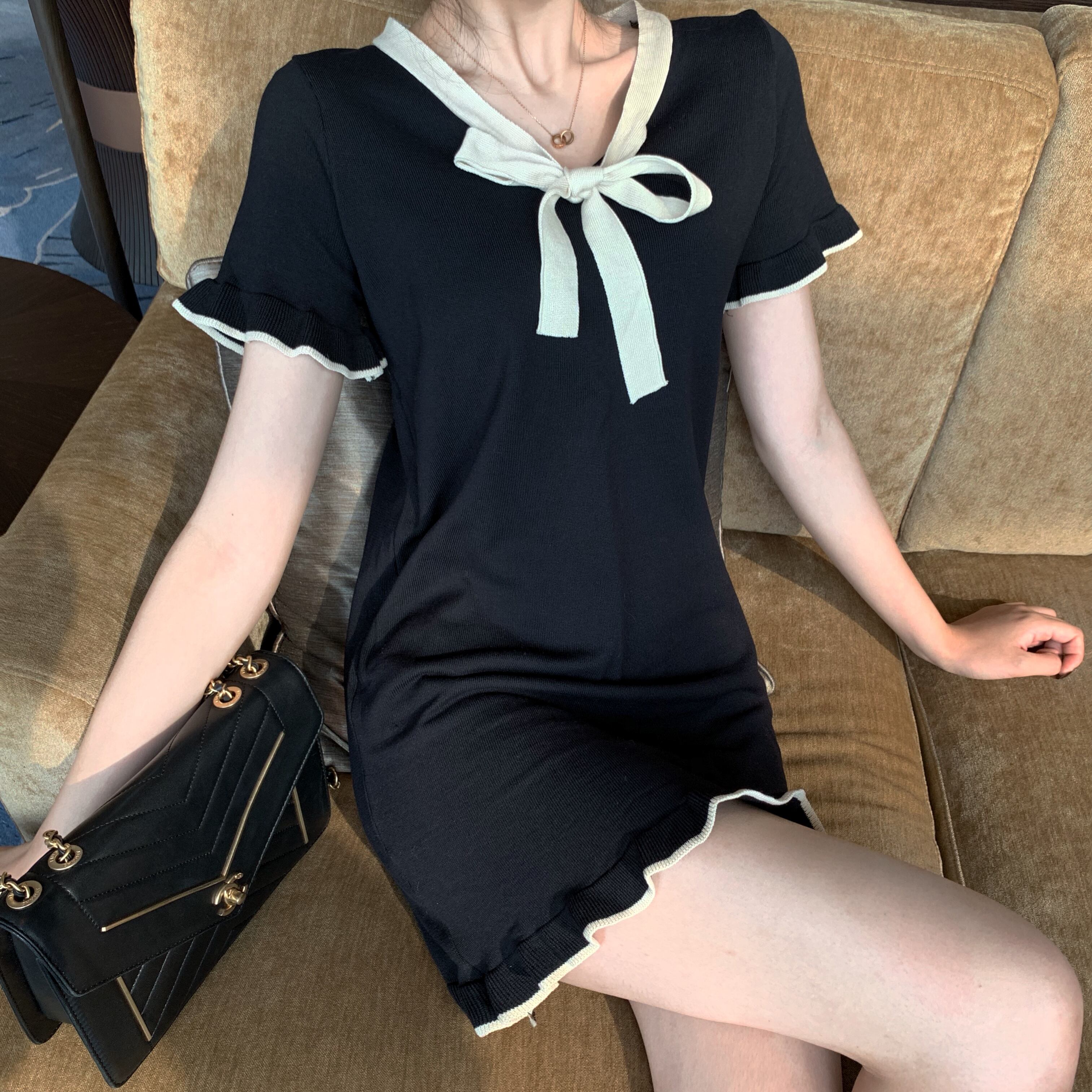 リボン ワンピース ミニ丈 膝上 フリル パイピング 半袖 タイト ミニワンピ シンプル 黒 ブラック レディース 無地 モノトーン ガーリー 姫系 妹コーデ カワイイ 安い 韓国 Vネック