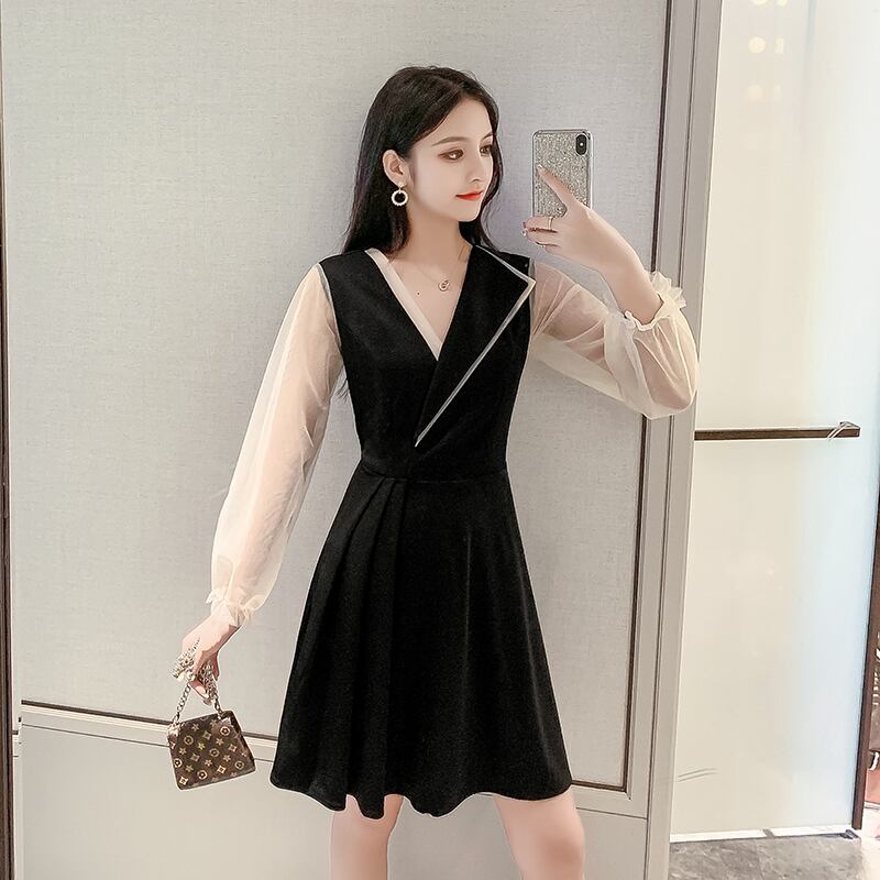 コート風デザイン ワンピース シフォン 長袖 シースルー フリル フレアシルエット ワンピ Vネック 黒 ブラック シンプル ガーリー フェミニン ジップ レディース 美ライン 春 夏 秋 大きいサイズ