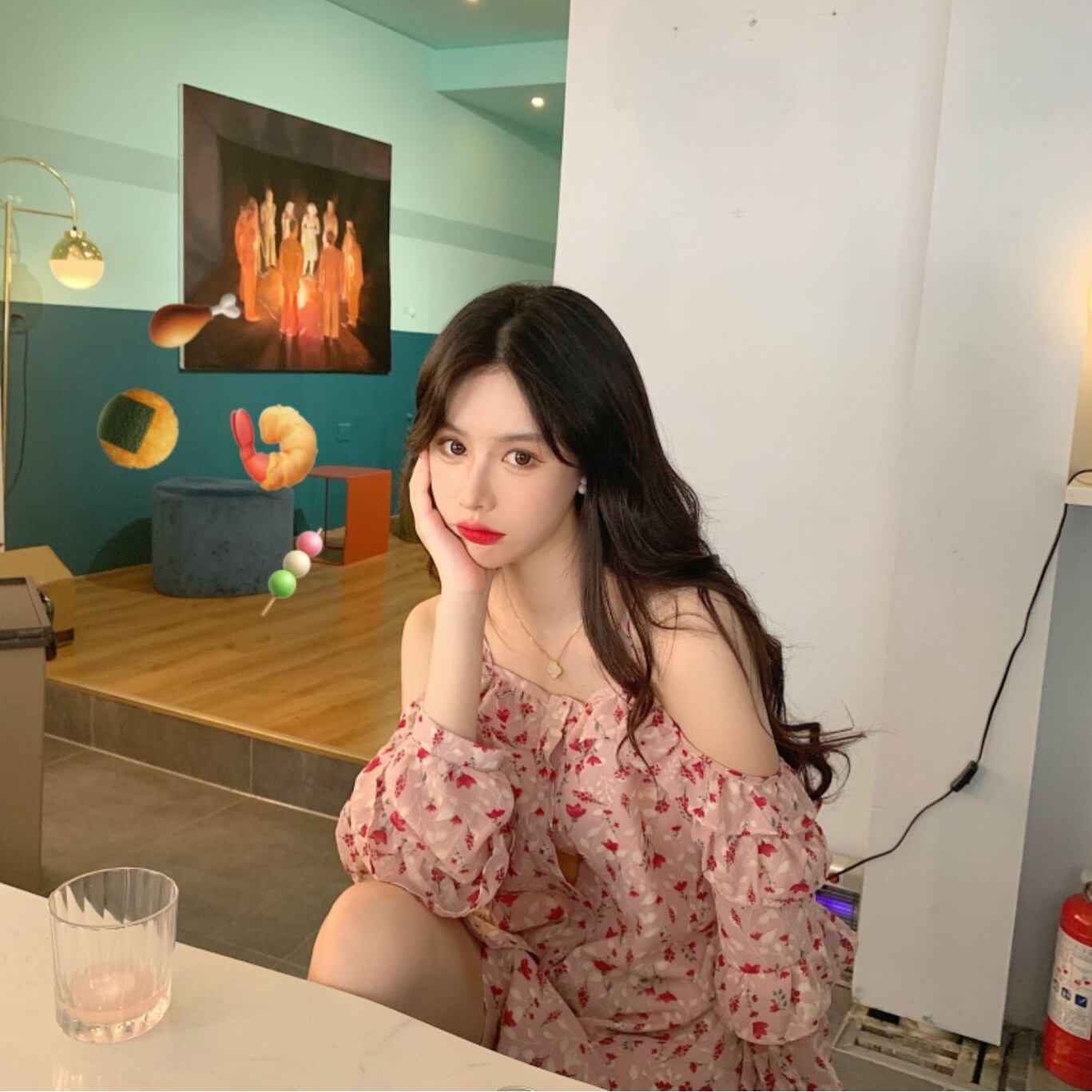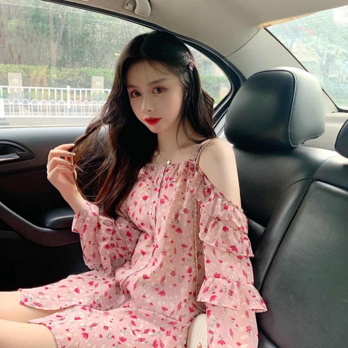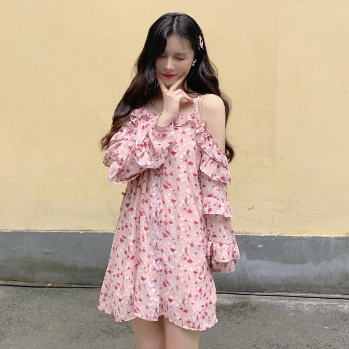 オフショルダー ワンピース ピンク 花柄 段フリル スリング シフォン フラワー カワイイ ガーリー 姫系 妹コーデ レディース セクシー 春 夏