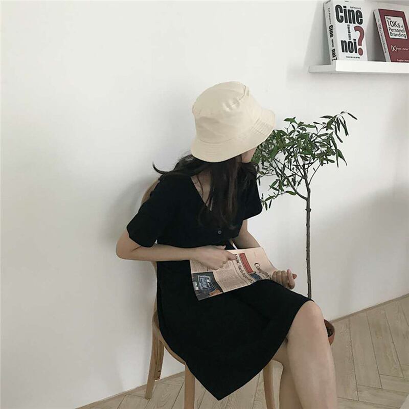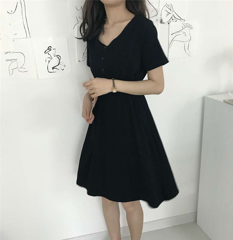 Vネック ワンピース 半袖 フレア ウエストゴム シンプル 無地 ブラック 大人 レディース 高見えコーデ 春 夏 エレガント カジュアル