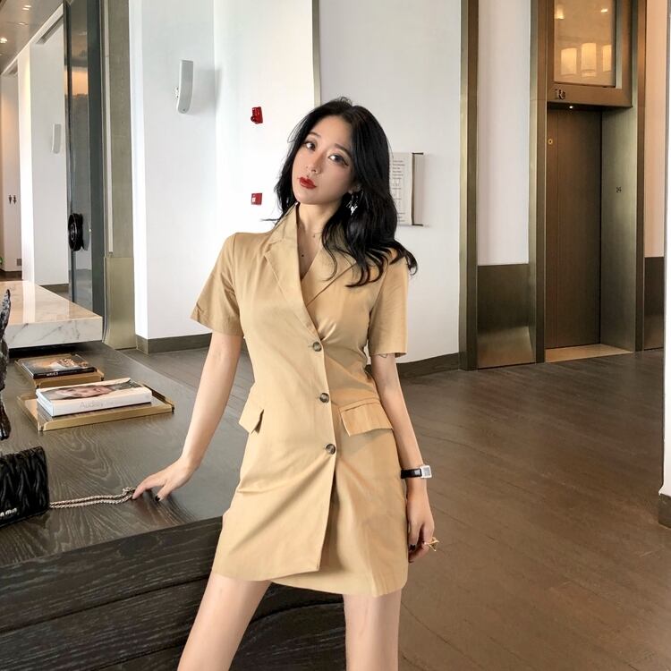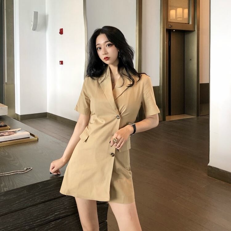 全2色 コート風ワンピース ワンピ ダブル襟 ボタン サイドポケット タイト スリム かっこいい かわいい 半袖 春 夏 エレガント おしゃれ