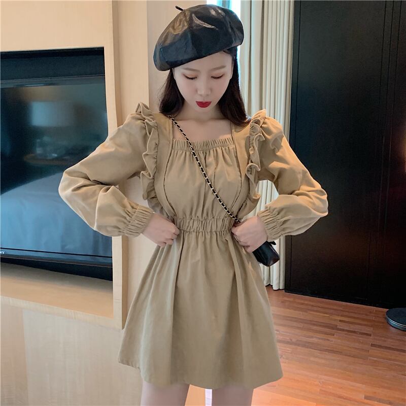 フリル 長袖 ワンピース ミニ丈 膝上 ハイウエスト スクエアカラー ウエストゴム レトロ カワイイ 森ガール ベージュ アプリコット フェミニン レディース 姫系 妹コーデ 甘辛コーデ 無地 春 秋