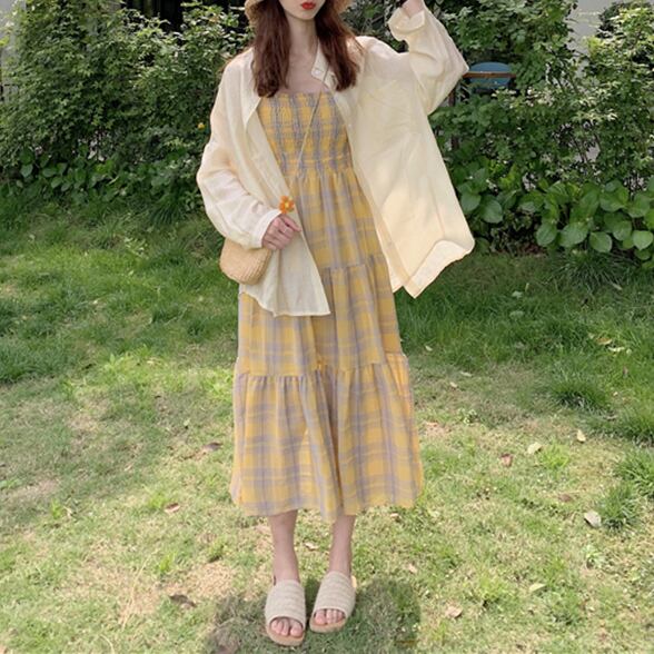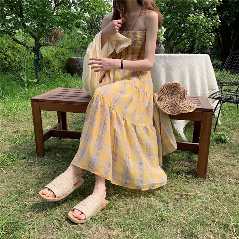夏らしいイエローのチェック柄が目を引くマキシワンピースです。