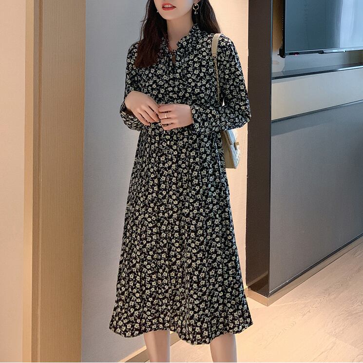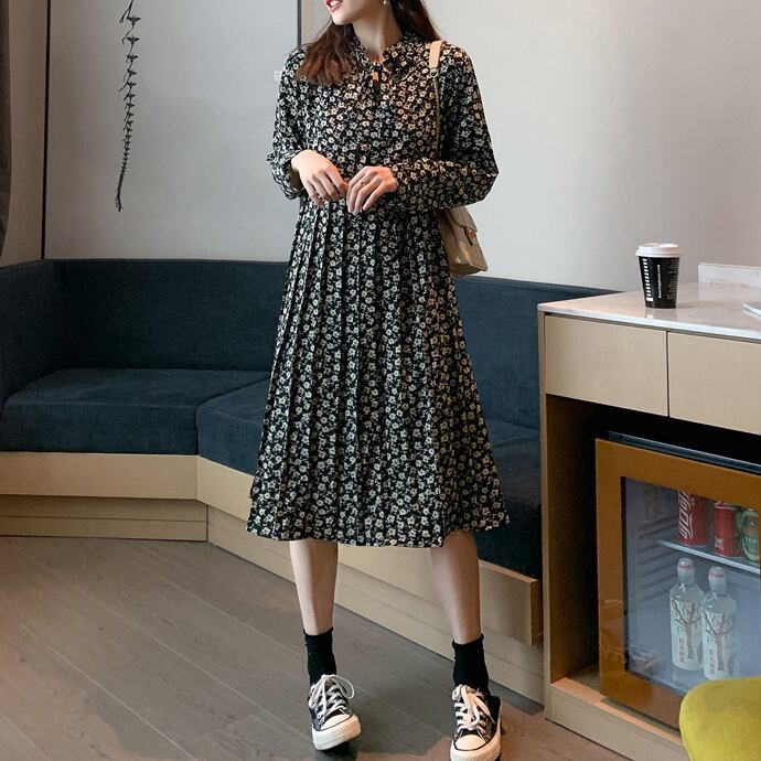 全2色 花柄 プリーツ ワンピース リボンタイ フレア シフォン Vネック ウエストリボン ハイウエスト Aライン 長袖 ワンピ ミモレ丈 可愛い 大人可愛い カジュアル レディース ガーリー ナチュラル レトロ フェミニン お出かけ 通勤 買い物 デート 女子会 大きいサイズ 春