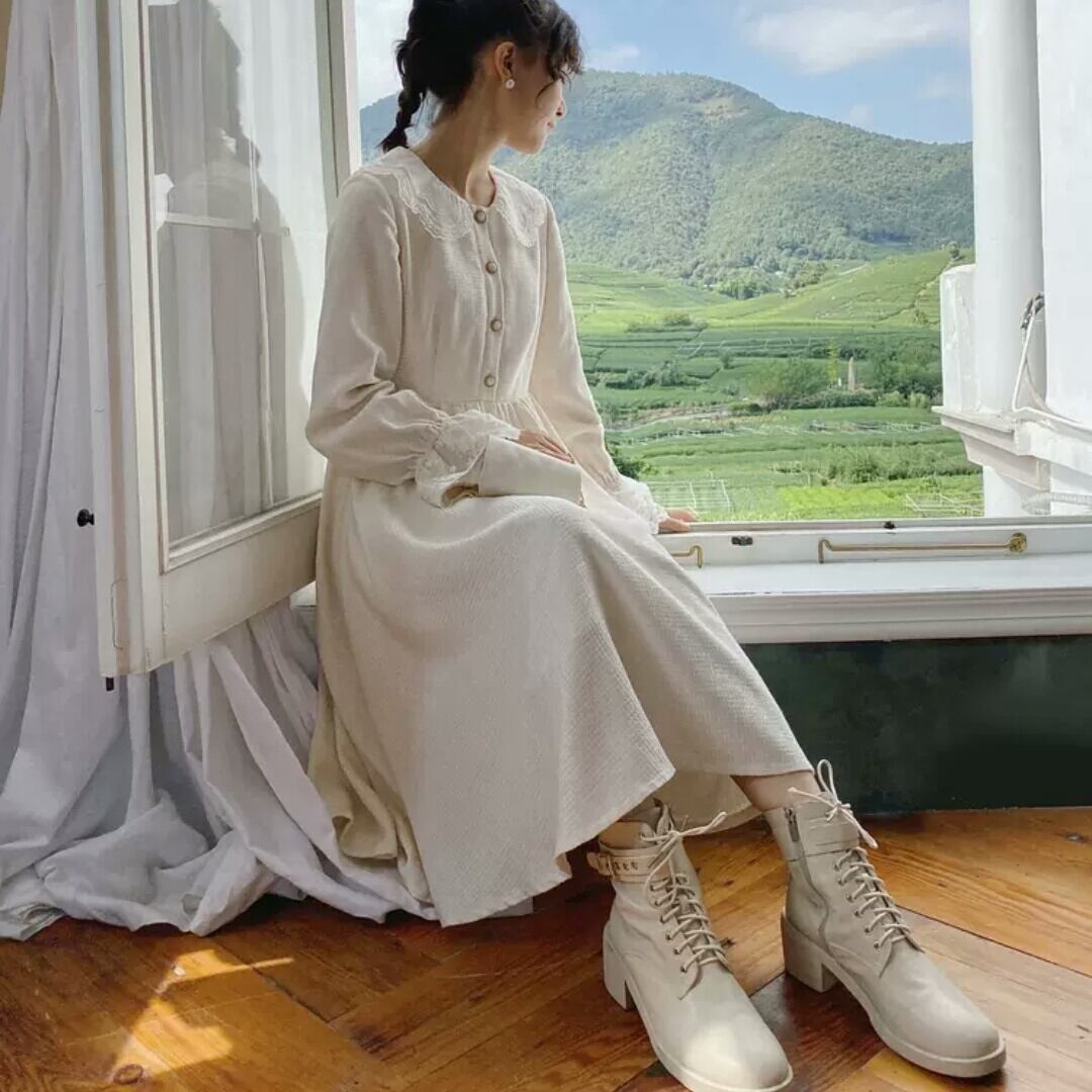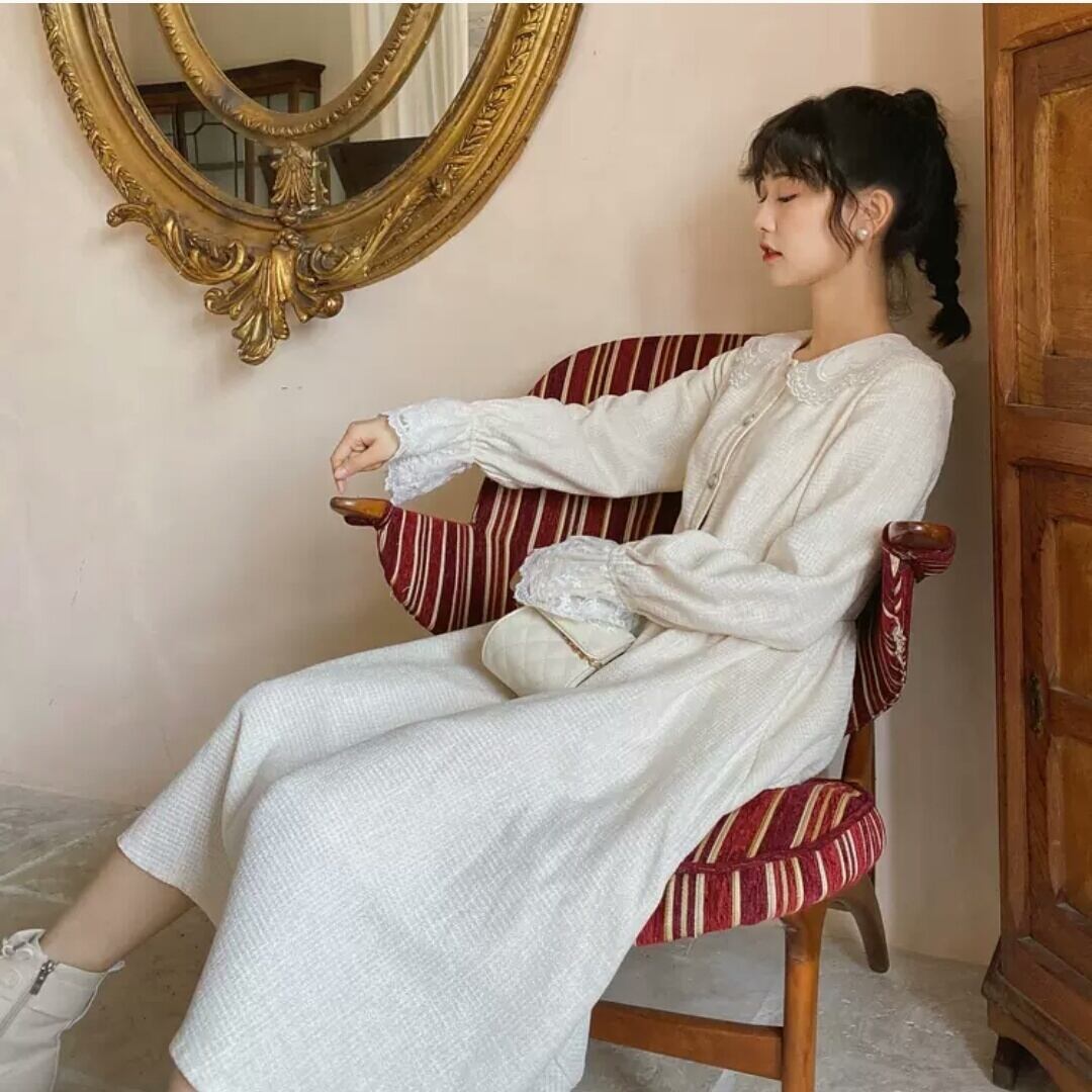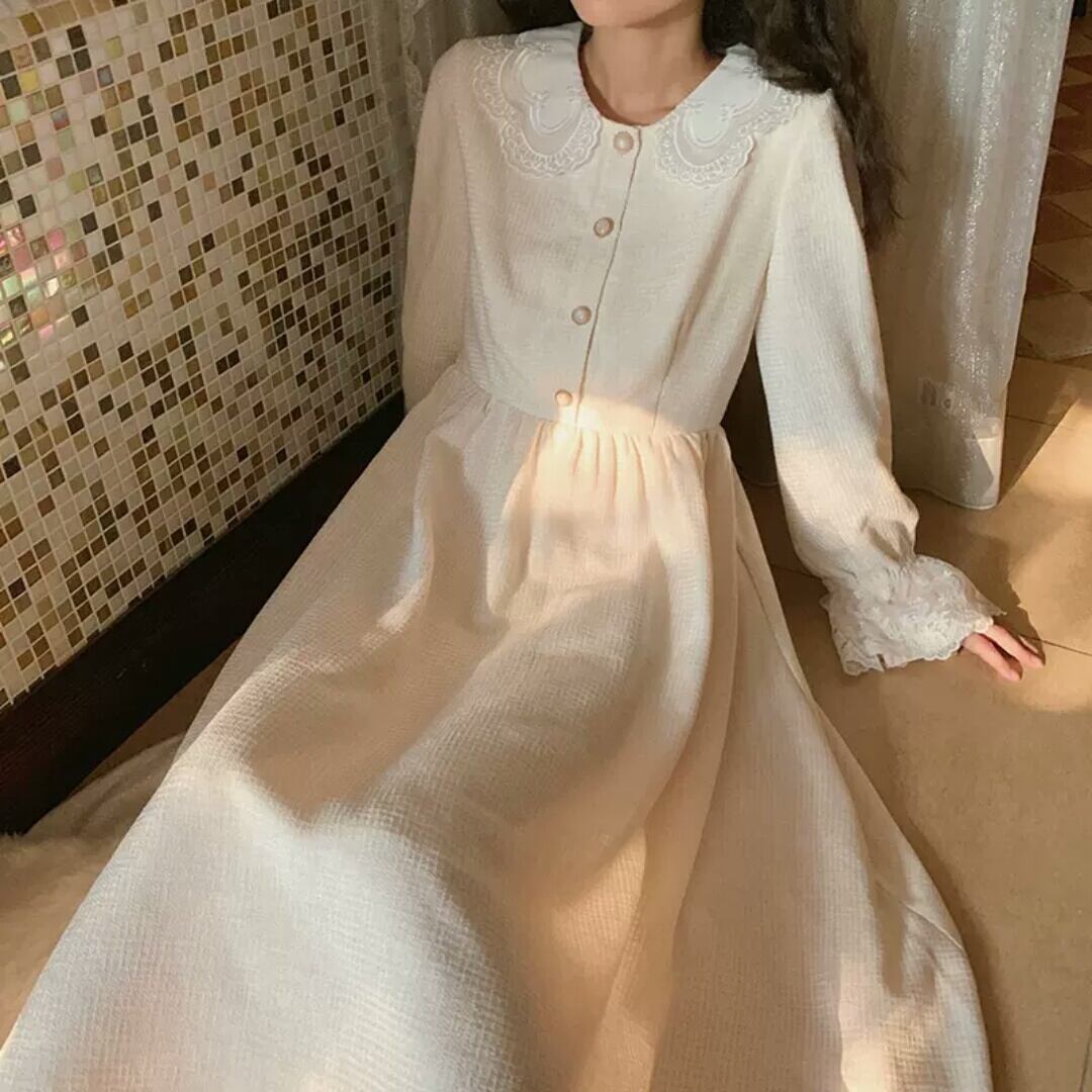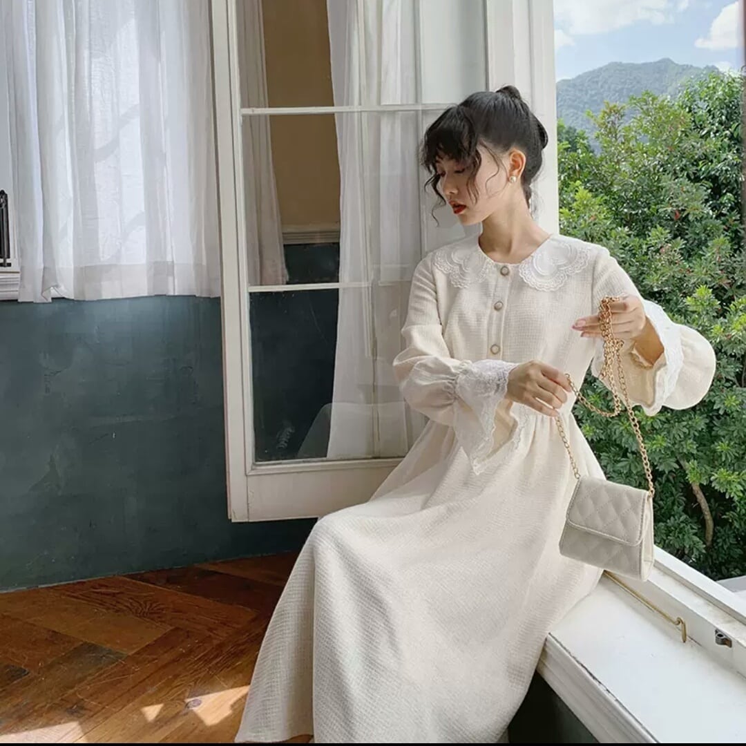 小さいサイズ 襟つき 長袖 ワンピース ドレス ロング丈 大人 可愛い キレイめ エレガント 上品 お出かけ お買い物 デート 女子会 春 夏 秋 通学 学生 通勤 韓国ファッション