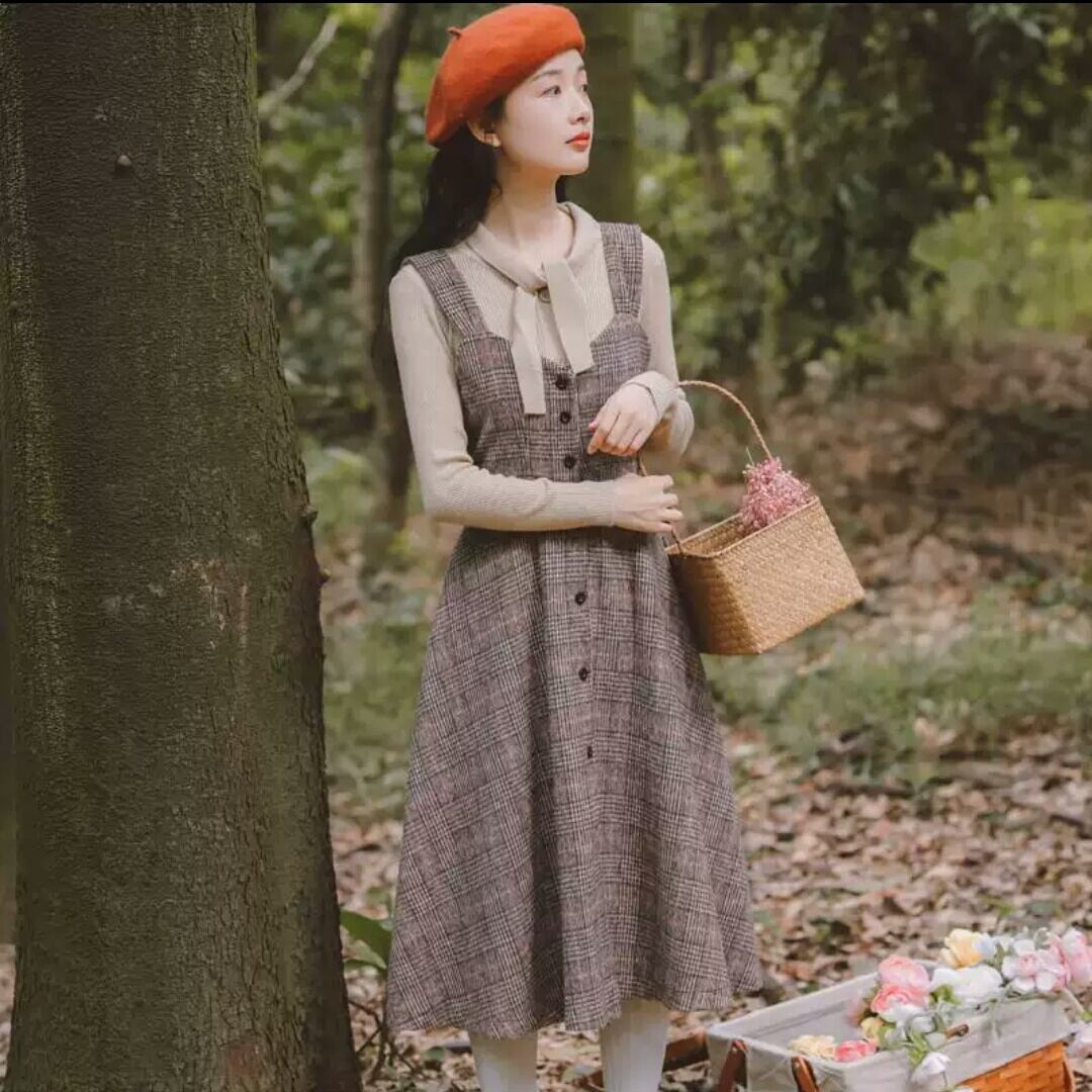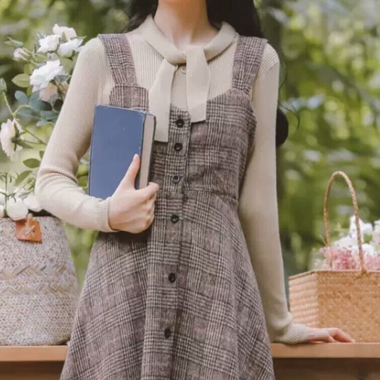 チェック柄 ストラップ ワンピース ロング丈 大人 可愛い キレイめ カジュアル お出かけ お買い物 デート 女子会 春 秋 通学 学生 通勤 韓国ファッション