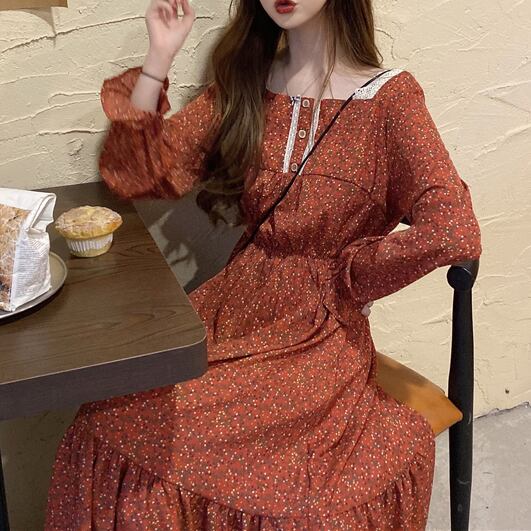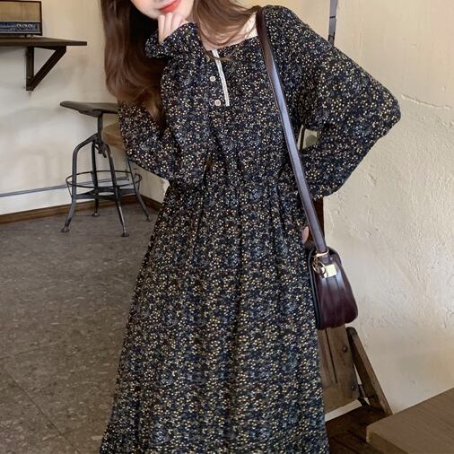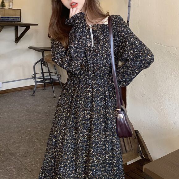 全2色 花柄 スクエアネック ティアードワンピース フレア Aライン レース ボタン フリル袖 長袖 ワンピ ミモレ丈 可愛い 大人可愛い カジュアル レディース ガーリー レトロ フェミニン お出かけ 買い物 デート 女子会 春