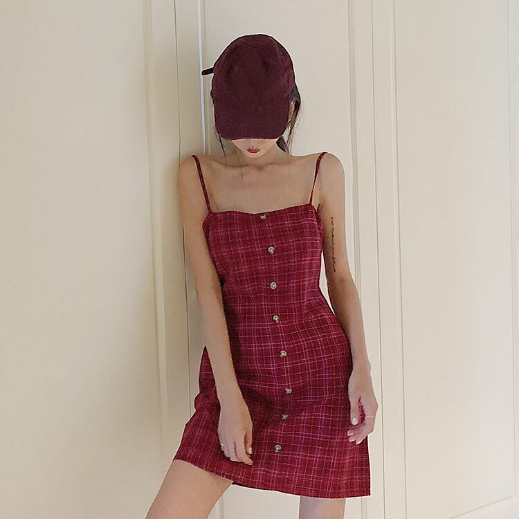 レッドチェックとフロントボタンがレトロ可愛いキャミワンピースです☆