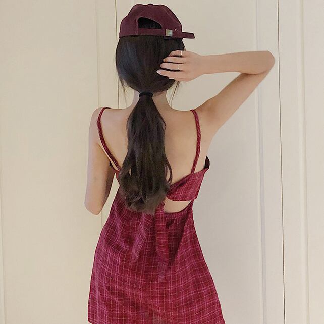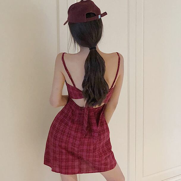 チェック柄 バックコンシャス キャミワンピ ワンピース フロントボタン バックリボン チェック ノースリーブ タイト ミニ丈 可愛い レディース ガーリー レトロ フェミニン お出かけ お買い物 デート 女子会 夏