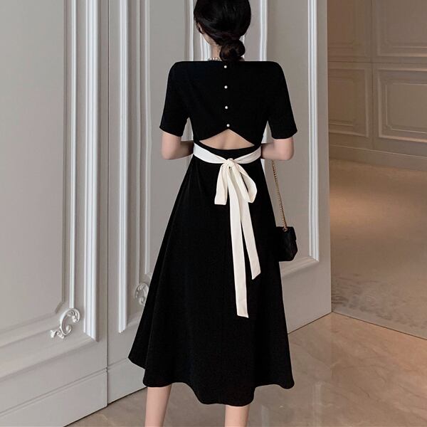 全2色 スクエアネック ワンピース バックリボン ボタン フレア ワンピ ミモレ丈 ハイウエスト Aライン 半袖 大人可愛い ガーリー レトロ フェミニン セクシー 通勤 お呼ばれ デート 女子会 夏
