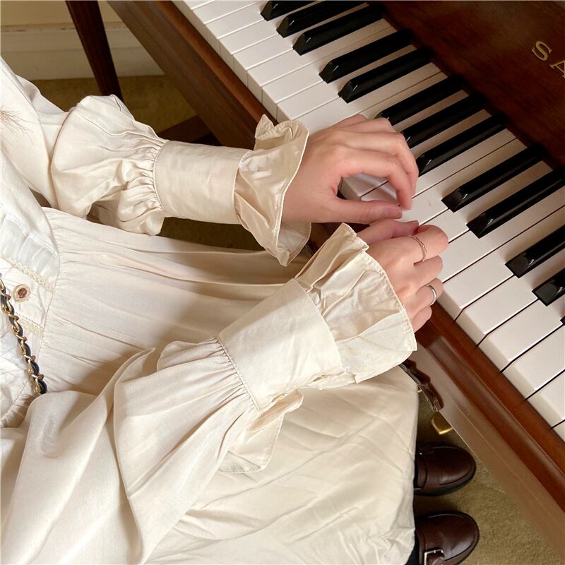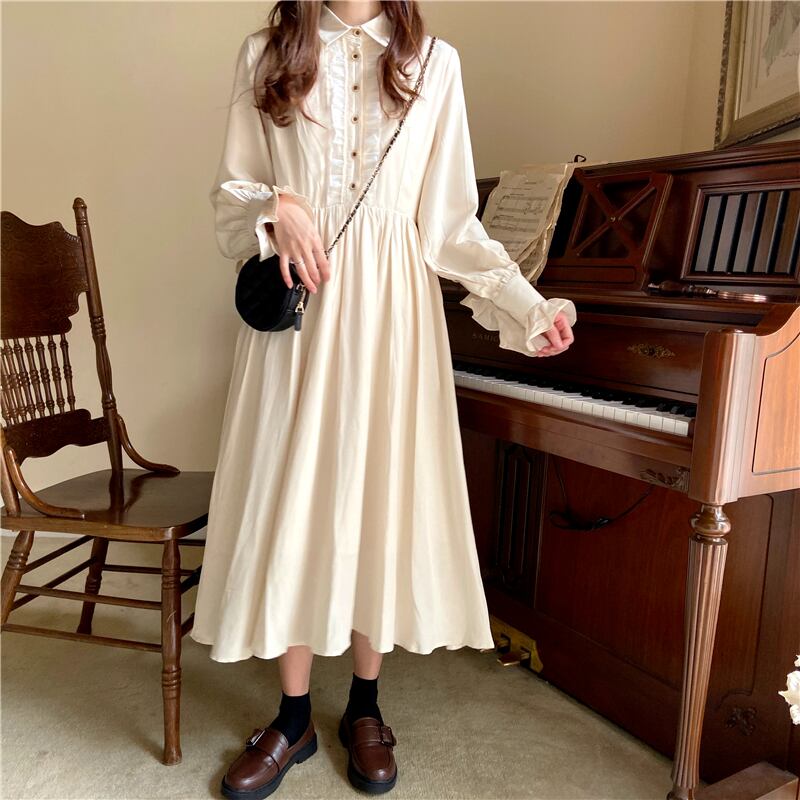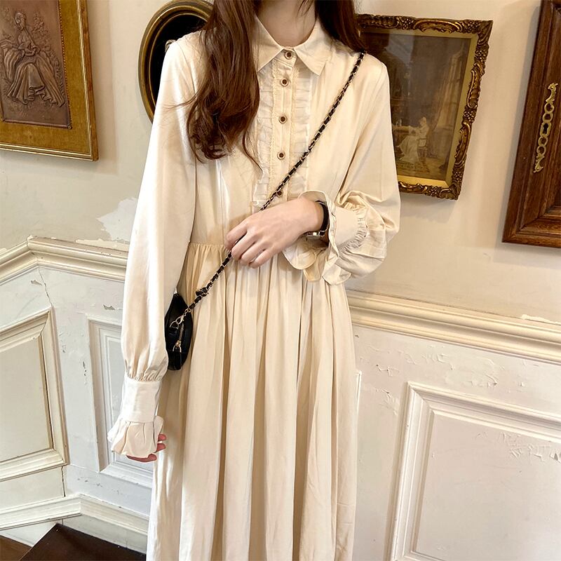 ワンピース ロング丈 長袖 ロングスリーブ フリル ブラウス風 フレア レトロ ボタン クラシカル ハイウエスト ハンドカフス エレガント シック レディース ドレス 春 秋 白 ホワイト