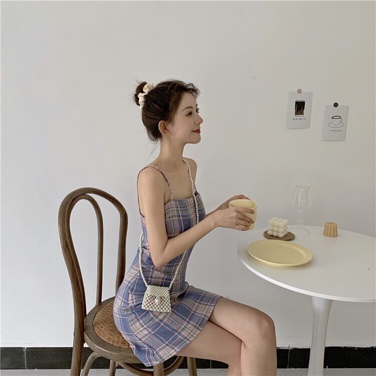 チェック柄 ワンピース キャミワンピ ミニ丈 膝上 スリングワンピース ベアワンピ風 お出かけ ブルー タータンチェック 肩紐 タイト スリム 春 夏