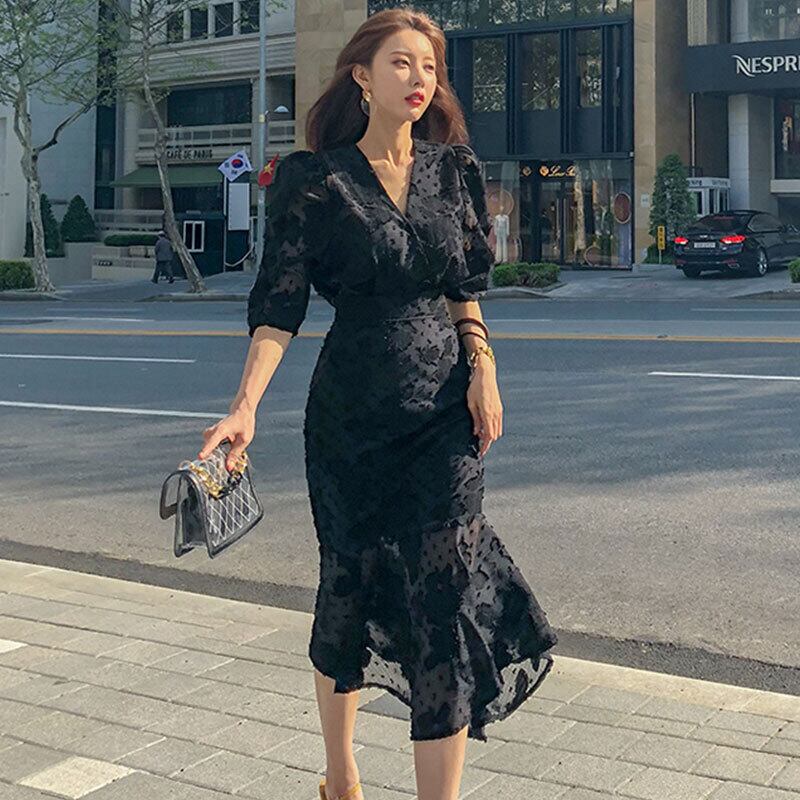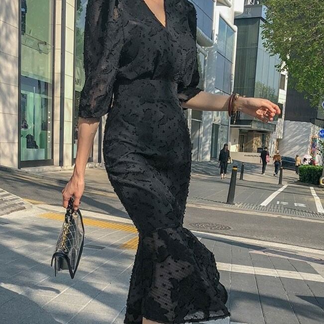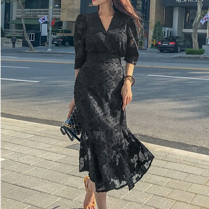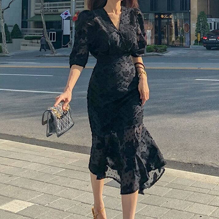 シフォン ワンピース ハイウエスト Vネック マーメイド フリル ジャガード 花柄 シック 大人 黒 ブラック 5分袖 フォーマル お呼ばれ 親睦 パーティー OL レディース クラシック シンプル エレガント 春 秋
