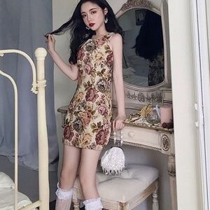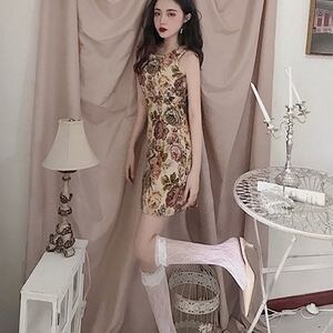 花柄 ワンピース ノースリーブ タイト ミニ丈 膝上 レトロ アンティーク風 ヨーロピアン フェミニン カワイイ ガーリー おしゃれ 女子 レディース 大人 ベージュ ミニドレス 春 夏 秋