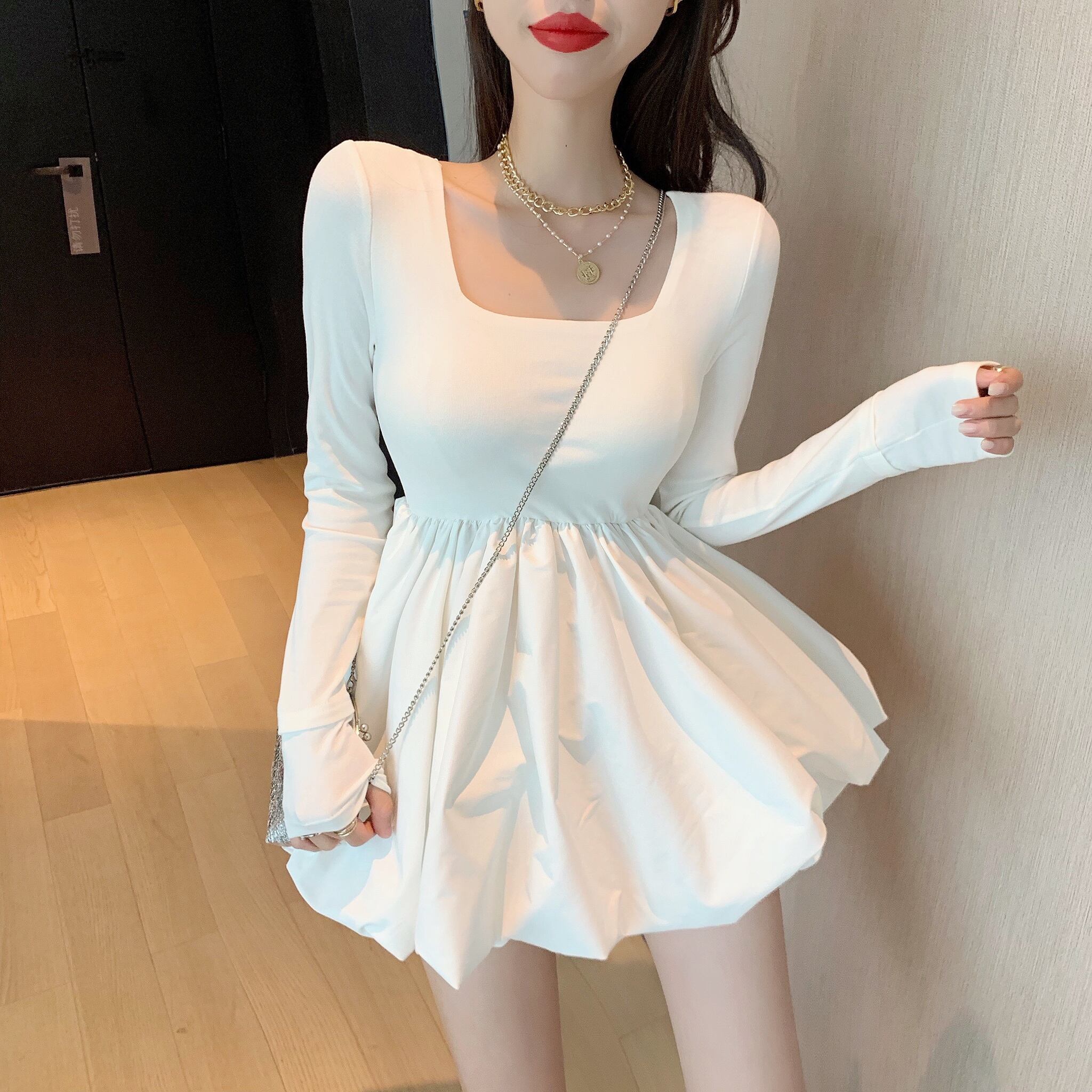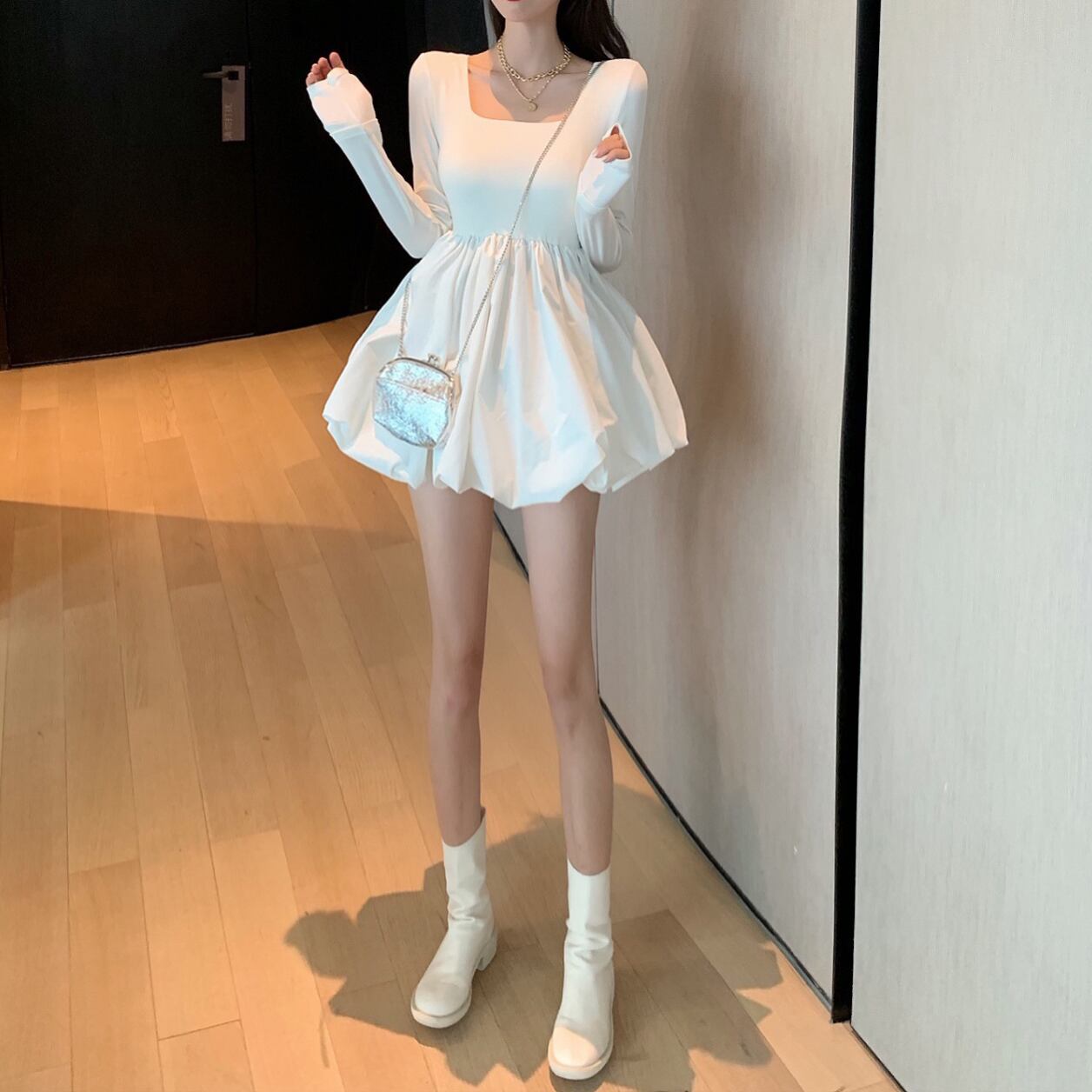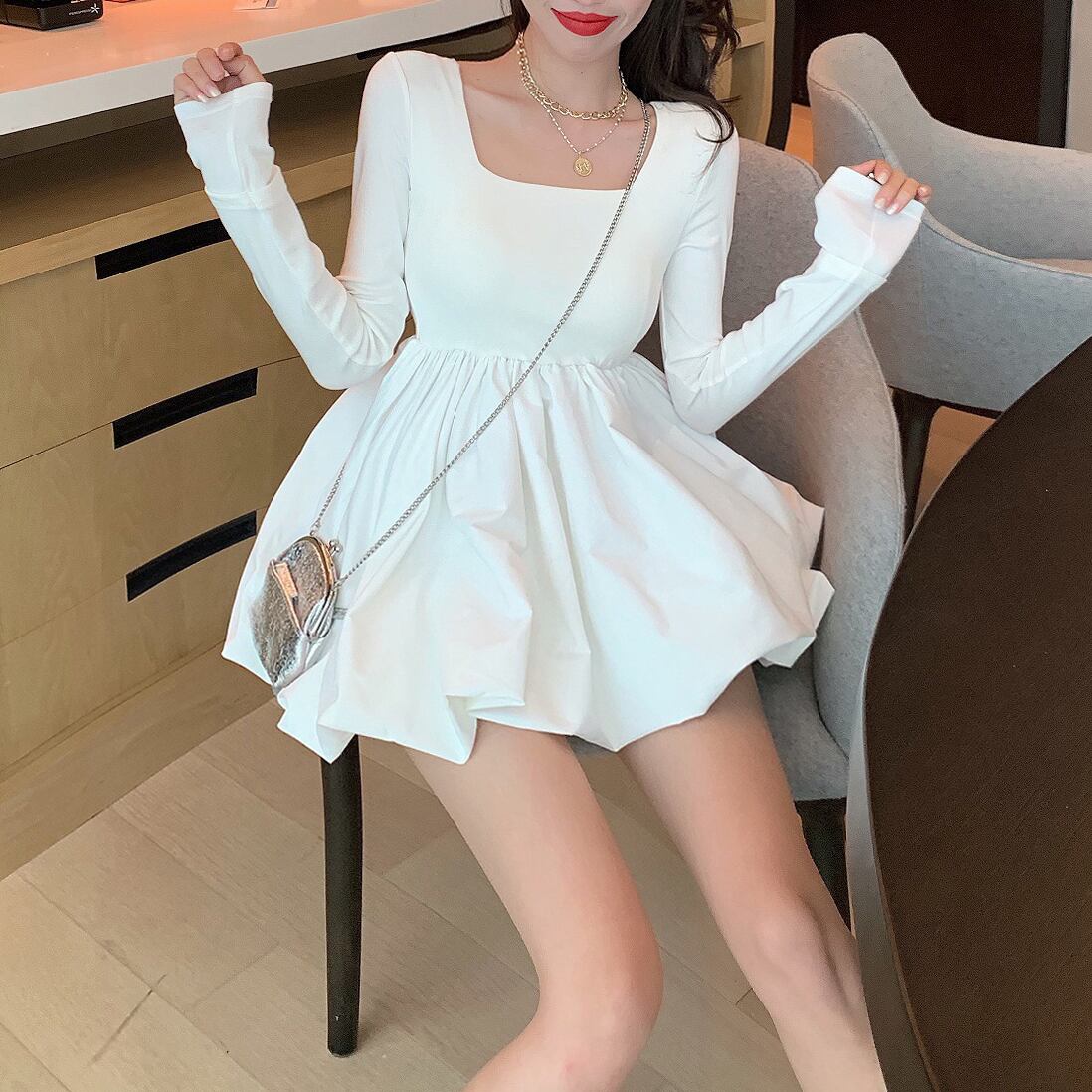スクエアネック バルーン ワンピース ハイウエスト 長半袖 ワンピ ミニ丈 ショート丈 可愛い 大人可愛い レディース フェミニン ガーリー シンプル 清楚 ふんわり お出かけ 買い物 デート 女子会 春